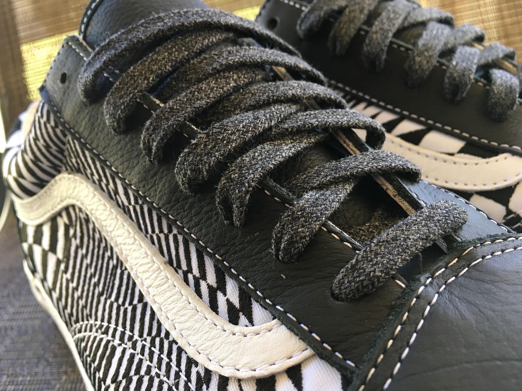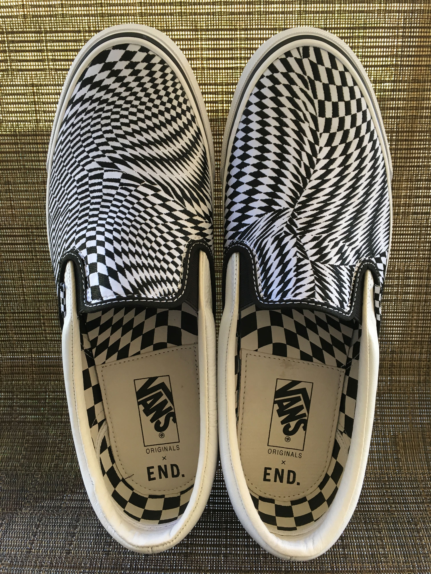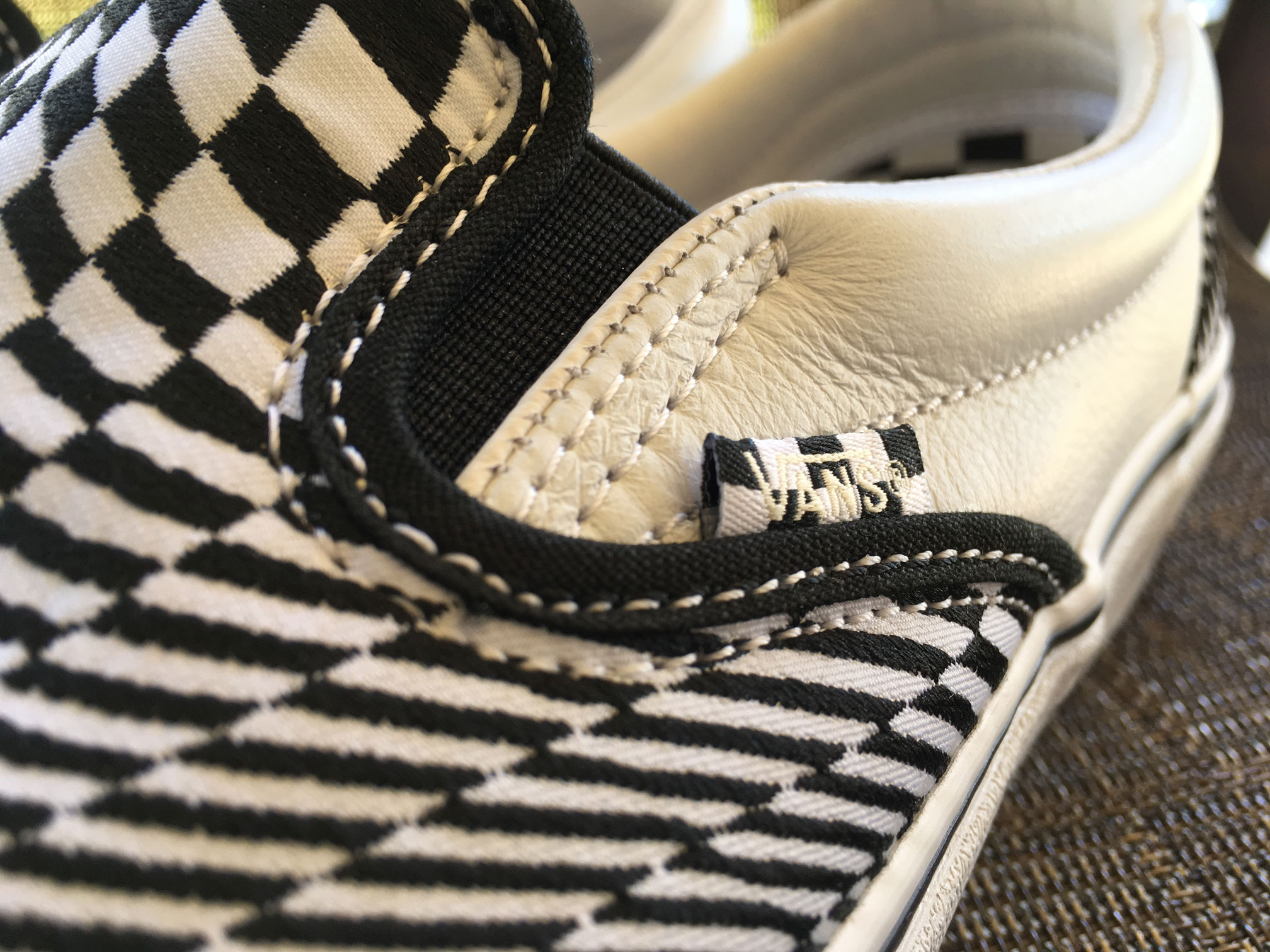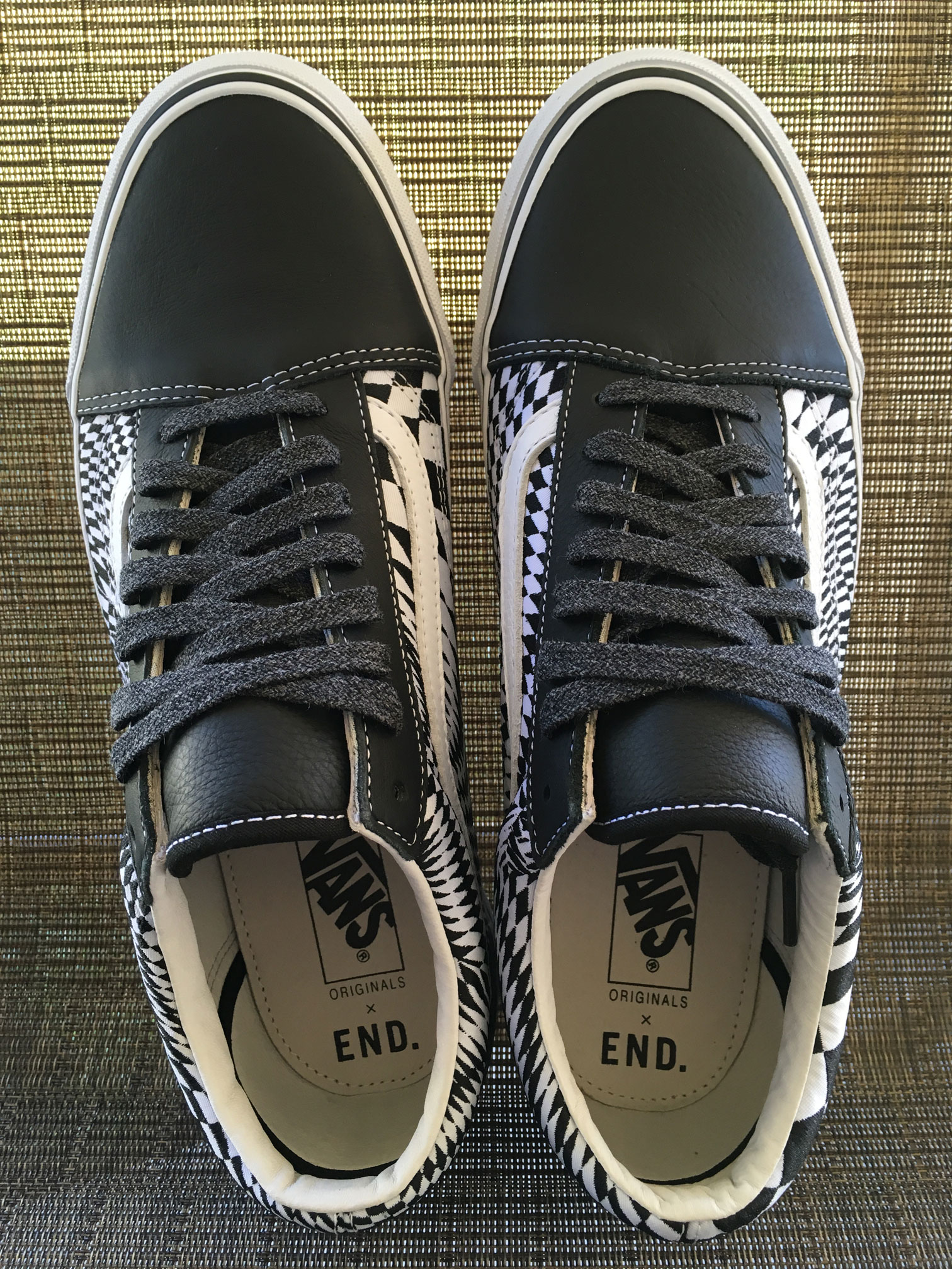 END. is set to release their latest project with Vault By Vans, an OG Classic Slip-On LX & OG Old Skool LX, and we wanted to give you a little bit of a P/Review of what to expect.  First of all, I want to thank END for the early plug on these, and for just allowing a Vans collector like myself, to have a little bit of an edge over the steep competition out there.  With Vans’ current hype, many of you Vans vets know the struggle!  But anyways, this is another banger to come out of the UK, and it’s no surprise that there is this more refined aesthetic that we seem to get from the Vault By Vans collaborations coming out of Europe.  END took the most iconic Vans shoe, the black and white checkerboard Slip-On, and literally put a twist on it.  We’ve seen the checkerboard done in so many color combos and materials, but this is the first time we’ve actually seen it morphed and twisted in this unique pattern.  To top it off, the pattern was woven, not printed, so each pair will have it’s own unique part of the fabric, so no two pairs should look the same.  Major props for that, alone!  It’s all about the execution, and the premium features don’t stop there.  We get premium full grain leather, complete with that soft slight wrinkling in it, that lets you know it’s good.  Pigskin linings are standard on your OG Vaults now days, but it’s still nice to mention.  The inner lining of the Slip-On is all checkerboard as well, with the footbeds carrying the same Vertigo pattern, and END branding on the heel pad.  The vulc soles are a natural white color.  I can’t forget to mention the super cool checkerboard Vans flag on the sides.  The Old Skool comes with 3 pairs of laces, which I opted for the grey wool-like ones.  Each pair will come in a larger over-sized custom velveteen wrapped box, the same one used for last year’s END collab, but this one is wrapped in the Vertigo themed checkerboard print.  What a nice finishing touch, to an already amazing pack.