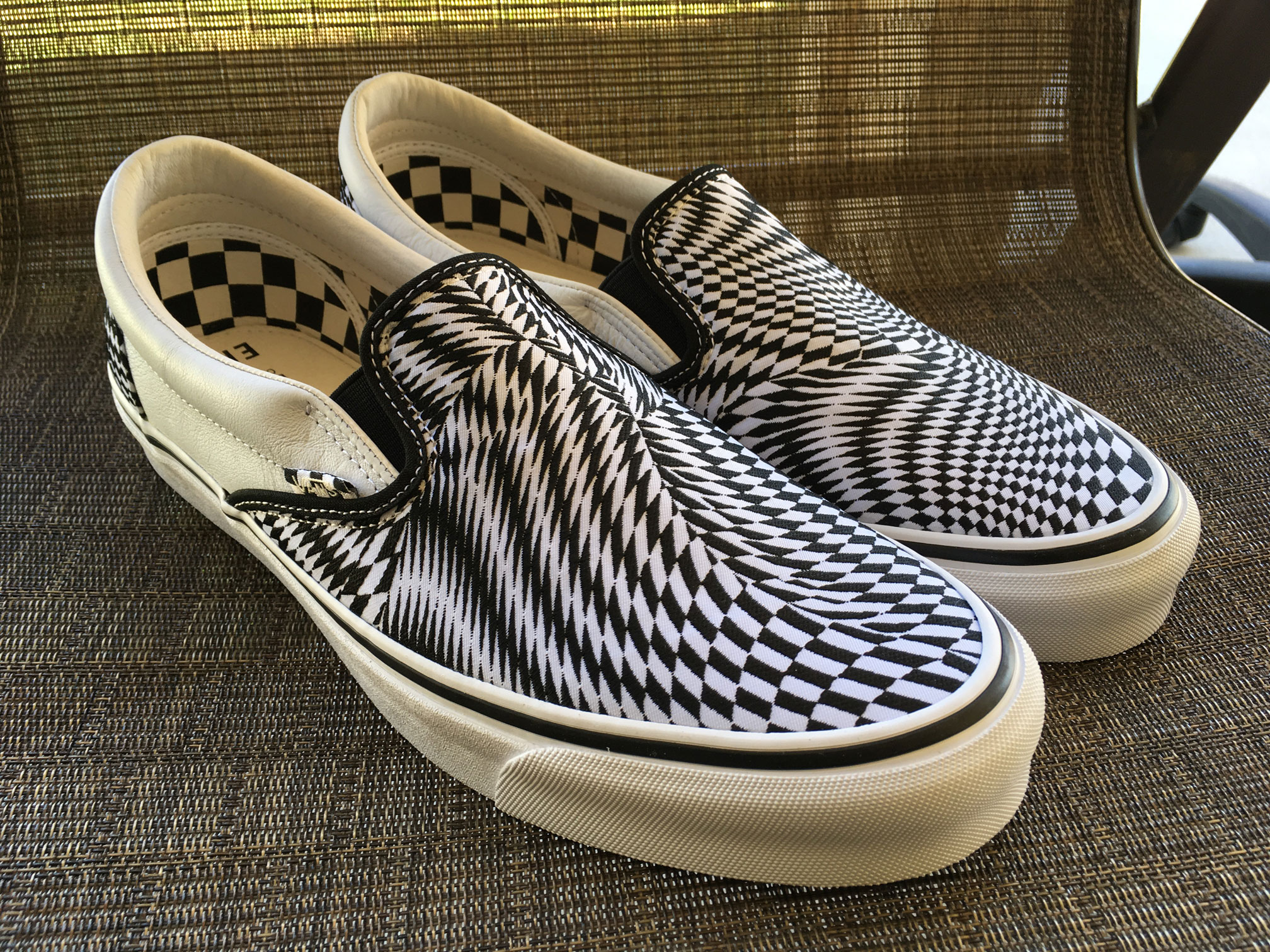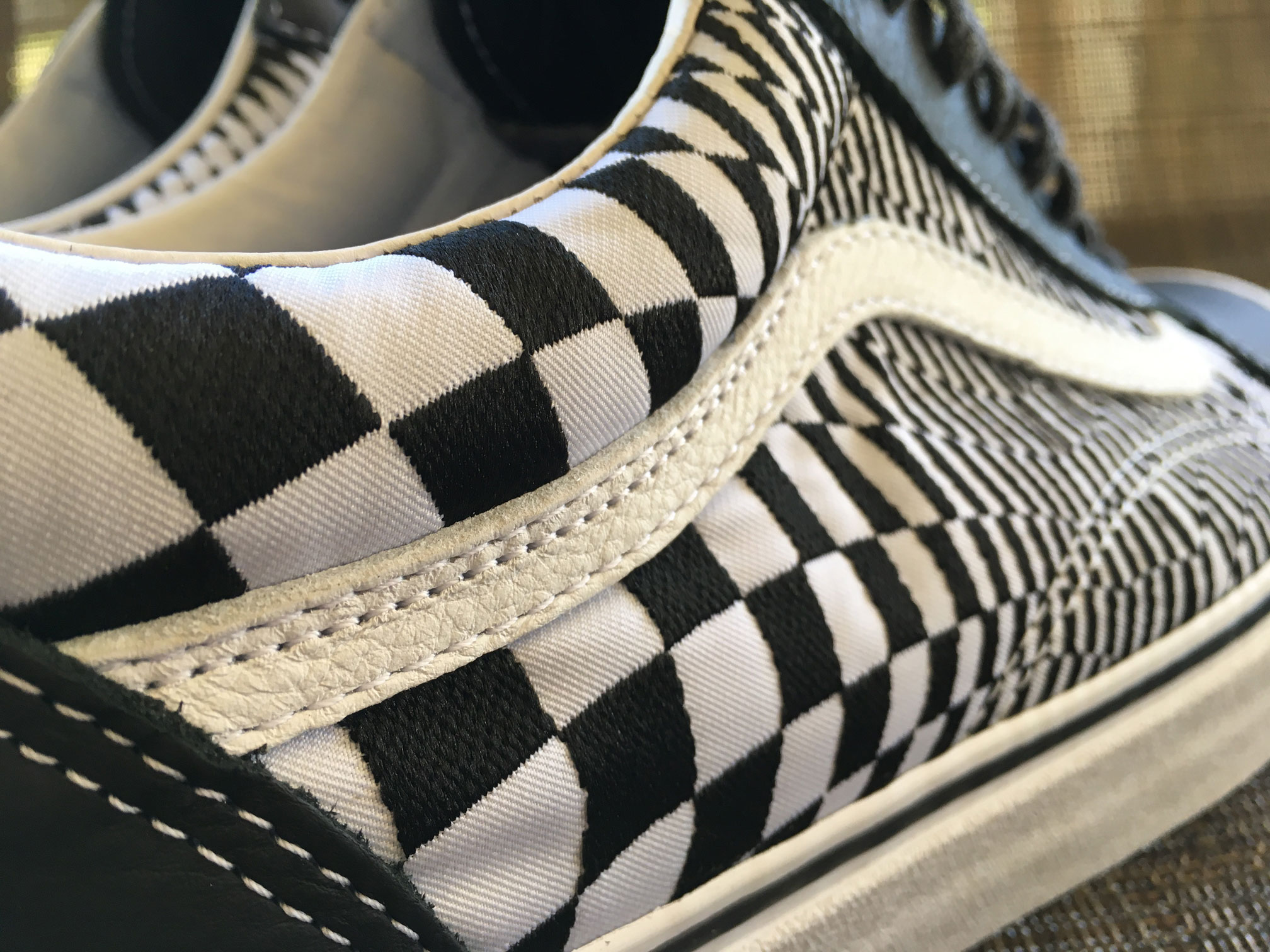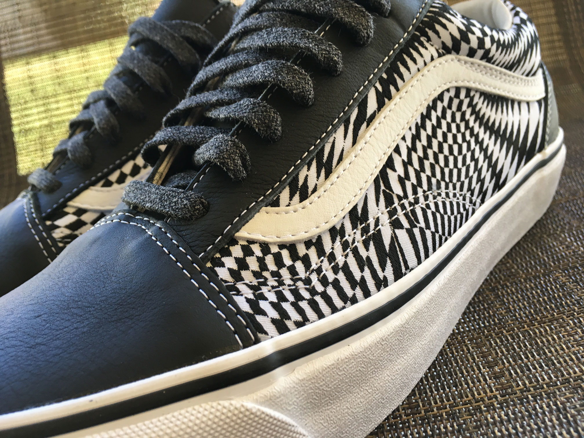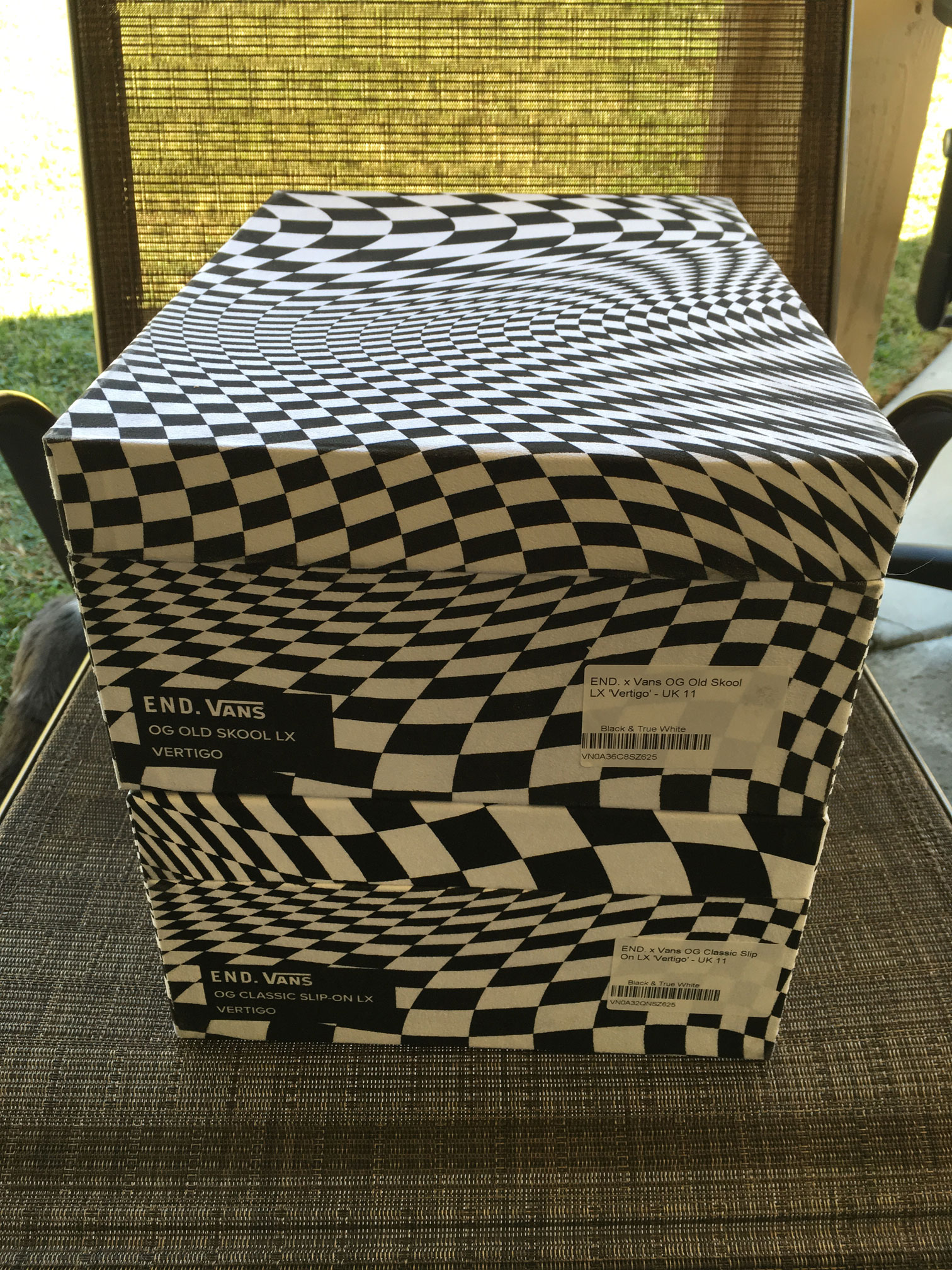END. is set to release their latest project with Vault By Vans, an OG Classic Slip-On LX & OG Old Skool LX, and we wanted to give you a little bit of a P/Review of what to expect.  First of all, I want to thank END for the early plug on these, and for just allowing a Vans collector like myself, to have a little bit of an edge over the steep competition out there.  With Vans’ current hype, many of you Vans vets know the struggle!  But anyways, this is another banger to come out of the UK, and it’s no surprise that there is this more refined aesthetic that we seem to get from the Vault By Vans collaborations coming out of Europe.  END took the most iconic Vans shoe, the black and white checkerboard Slip-On, and literally put a twist on it.  We’ve seen the checkerboard done in so many color combos and materials, but this is the first time we’ve actually seen it morphed and twisted in this unique pattern.  To top it off, the pattern was woven, not printed, so each pair will have it’s own unique part of the fabric, so no two pairs should look the same.  Major props for that, alone!  It’s all about the execution, and the premium features don’t stop there.  We get premium full grain leather, complete with that soft slight wrinkling in it, that lets you know it’s good.  Pigskin linings are standard on your OG Vaults now days, but it’s still nice to mention.  The inner lining of the Slip-On is all checkerboard as well, with the footbeds carrying the same Vertigo pattern, and END branding on the heel pad.  The vulc soles are a natural white color.  I can’t forget to mention the super cool checkerboard Vans flag on the sides.  The Old Skool comes with 3 pairs of laces, which I opted for the grey wool-like ones.  Each pair will come in a larger over-sized custom velveteen wrapped box, the same one used for last year’s END collab, but this one is wrapped in the Vertigo themed checkerboard print.  What a nice finishing touch, to an already amazing pack.