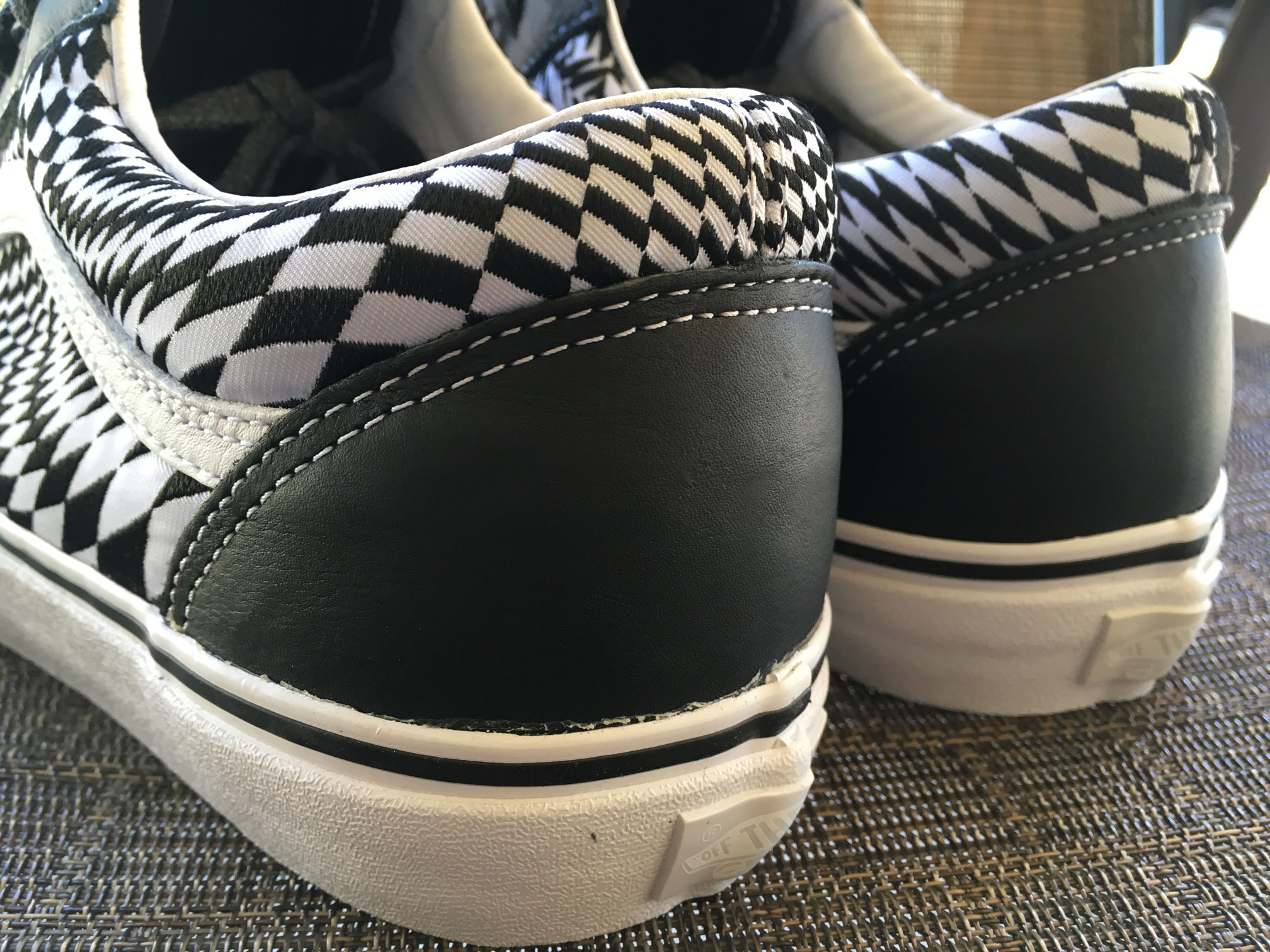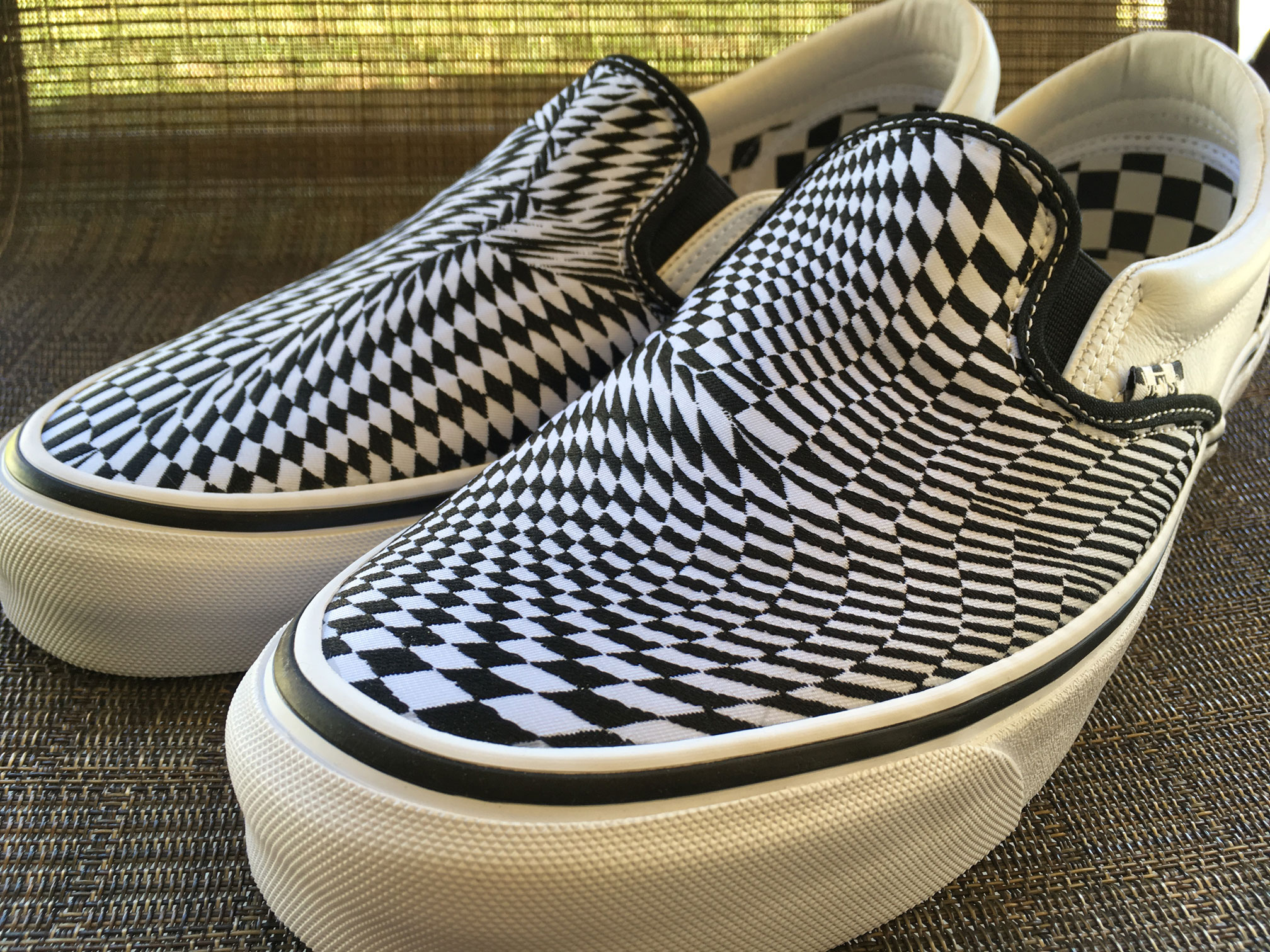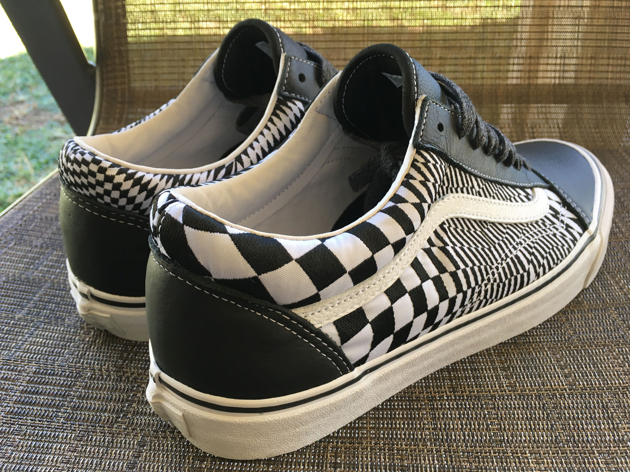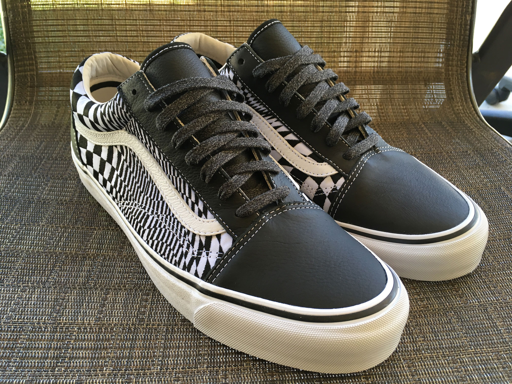 END. is set to release their latest project with Vault By Vans, an OG Classic Slip-On LX & OG Old Skool LX, and we wanted to give you a little bit of a P/Review of what to expect.  First of all, I want to thank END for the early plug on these, and for just allowing a Vans collector like myself, to have a little bit of an edge over the steep competition out there.  With Vans’ current hype, many of you Vans vets know the struggle!  But anyways, this is another banger to come out of the UK, and it’s no surprise that there is this more refined aesthetic that we seem to get from the Vault By Vans collaborations coming out of Europe.  END took the most iconic Vans shoe, the black and white checkerboard Slip-On, and literally put a twist on it.  We’ve seen the checkerboard done in so many color combos and materials, but this is the first time we’ve actually seen it morphed and twisted in this unique pattern.  To top it off, the pattern was woven, not printed, so each pair will have it’s own unique part of the fabric, so no two pairs should look the same.  Major props for that, alone!  It’s all about the execution, and the premium features don’t stop there.  We get premium full grain leather, complete with that soft slight wrinkling in it, that lets you know it’s good.  Pigskin linings are standard on your OG Vaults now days, but it’s still nice to mention.  The inner lining of the Slip-On is all checkerboard as well, with the footbeds carrying the same Vertigo pattern, and END branding on the heel pad.  The vulc soles are a natural white color.  I can’t forget to mention the super cool checkerboard Vans flag on the sides.  The Old Skool comes with 3 pairs of laces, which I opted for the grey wool-like ones.  Each pair will come in a larger over-sized custom velveteen wrapped box, the same one used for last year’s END collab, but this one is wrapped in the Vertigo themed checkerboard print.  What a nice finishing touch, to an already amazing pack.