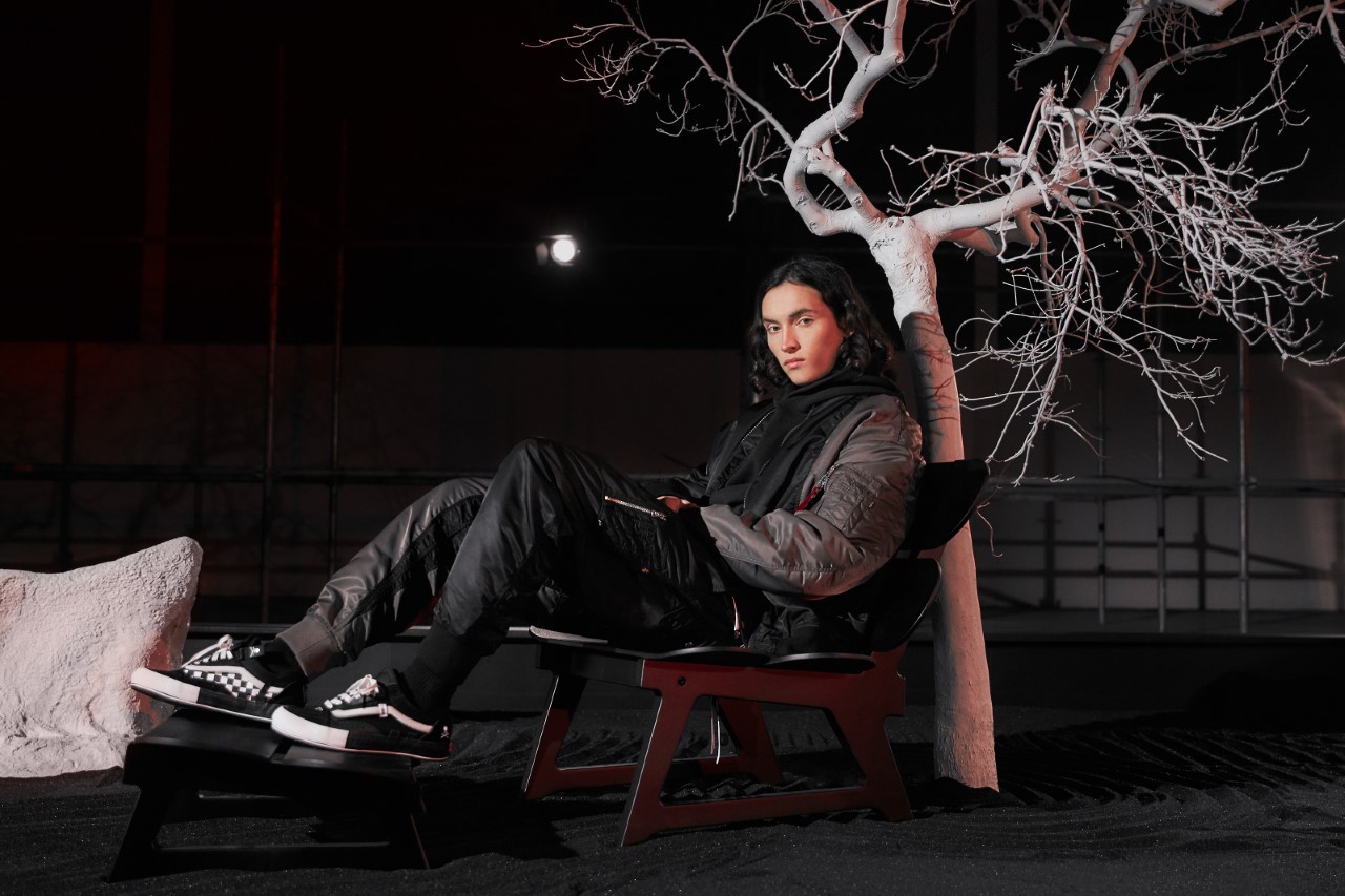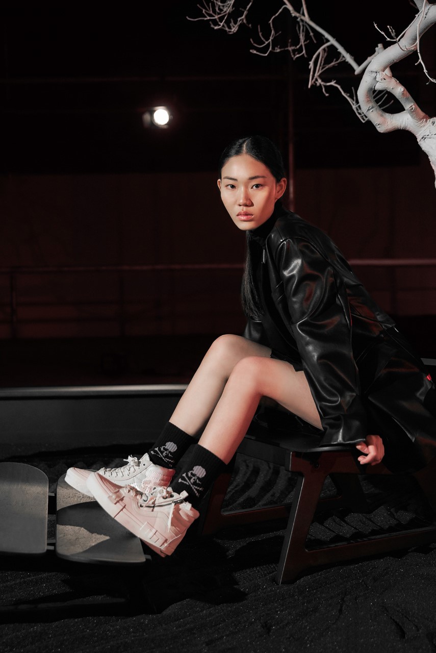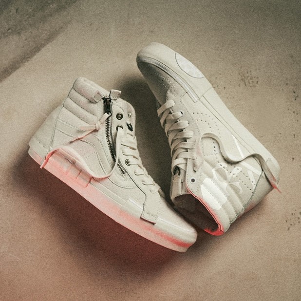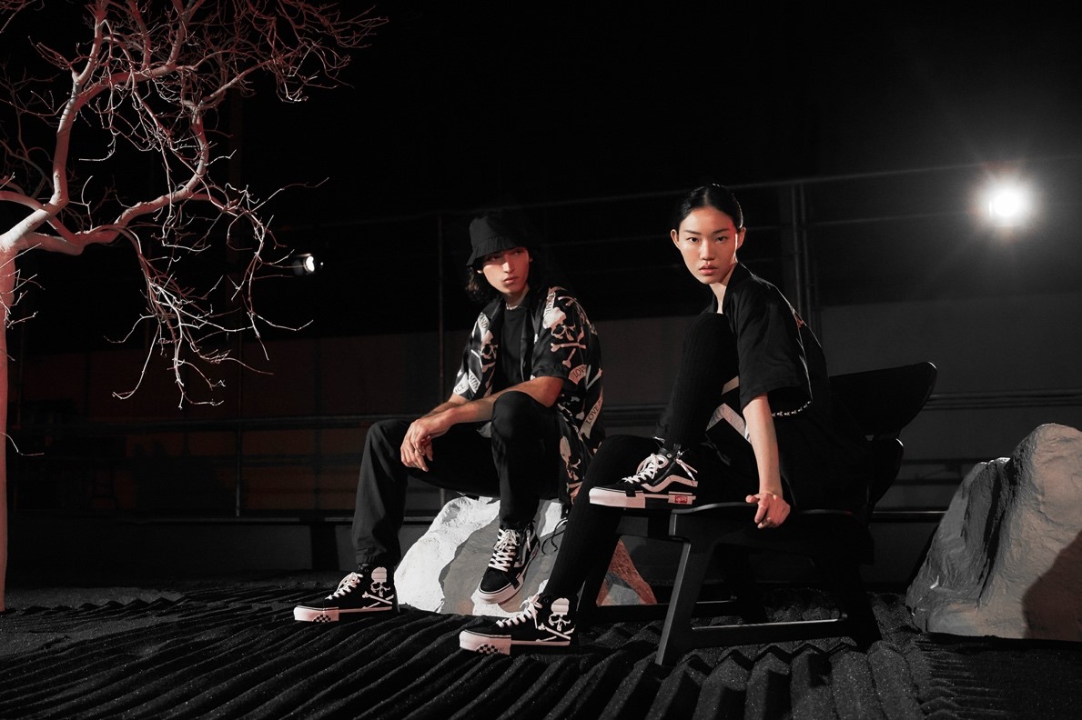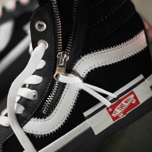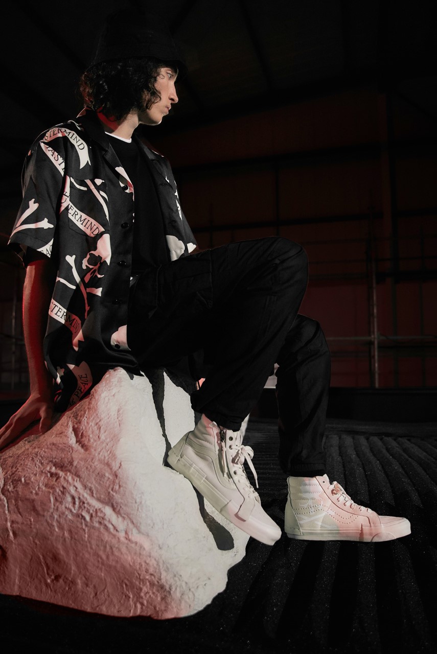 The same experimental approach is used on the Sk8-Hi Cap LX, with the uppers detailed with skull branding and zips to reflect Homma’s rebellious sensibility. The sole unit, meanwhile, is deconstructed, with its foxing tape split, layered and misaligned to adhere to the collection’s cut-and-paste inspiration.