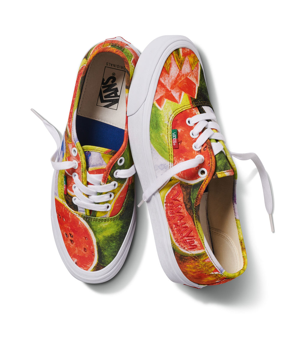 Referencing works both immediately recognizable and lesser known, the collection includes three iconic Vans styles: an OG Sk8-Hi LX featuring Frida’s self-portrait alongside a dark green toe cap, an OG Authentic LX with all-over watermelon print and embroidered details and an OG Slip-On LX celebrating Kahlo’s famed 1940 painting, Self-Portrait with Thorn Necklace and Hummingbird. Each style features a vulcanized sole and crushed leather cushioned heel liner.
