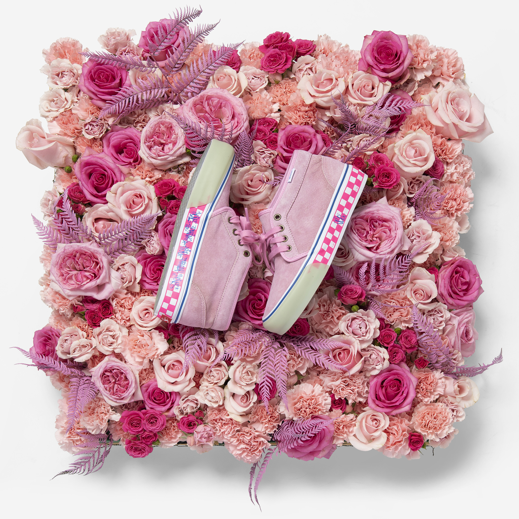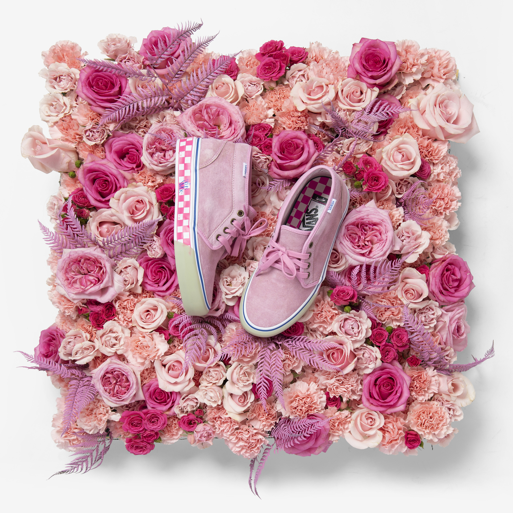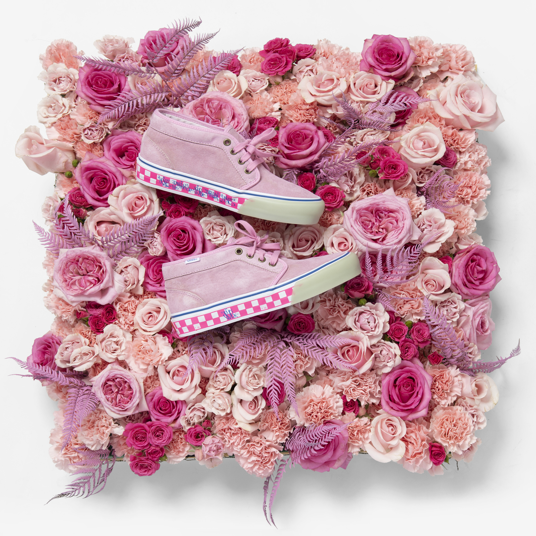 Titled “Roses Grown in Granite,” Gorecki continues to stay true to both his focus on quality textiles and his love for Philadelphia skateboarding, with another premium take on his favorite Vans silhouette, the Chukka Boot. Butter soft suede uppers in Marshmallow and Pink play against a Crystal Blue translucent bumper and waffle sole, while a knock out Racing Pink checkerboard midsole sets things off with “JSP,” “215” and “LOVE” hits in a custom Philly hand style by Joe Lees. The tags are repeated on matching Vans Ultracush® insole, driving home Gorecki’s love for all the skaters who made the city blocks at 15th and JFK a place of legend