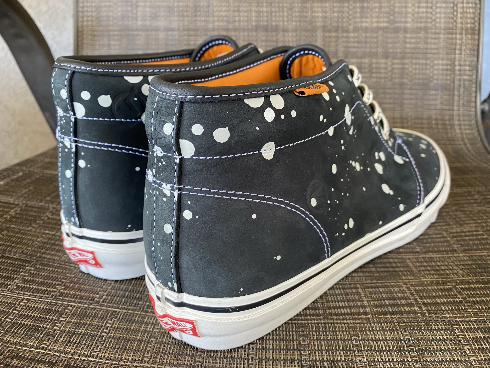 So right off the bat, this sophomore collection checks all the boxes when it comes to what we consider a proper collaboration. It’s been awhile since we’ve discussed the criteria, so for our new friends, here’s the 5 things we like to see: (1) New and original material, design element, or color, (2) Thoughtful packaging, (3) Branding, (4) Story or connection to something, (5) Limited or exclusive (preferably numbered when possible). This collection hits on all of that. From the combination of nubuck suede, paint splatter, and debossed Vans circle logos, to the super dope lime green brick drawer boxes, to the subtle branding on the outside forefoot of the vulc sidewalls and back side of the Vans flag, to the story connection of their print studio in NYC.