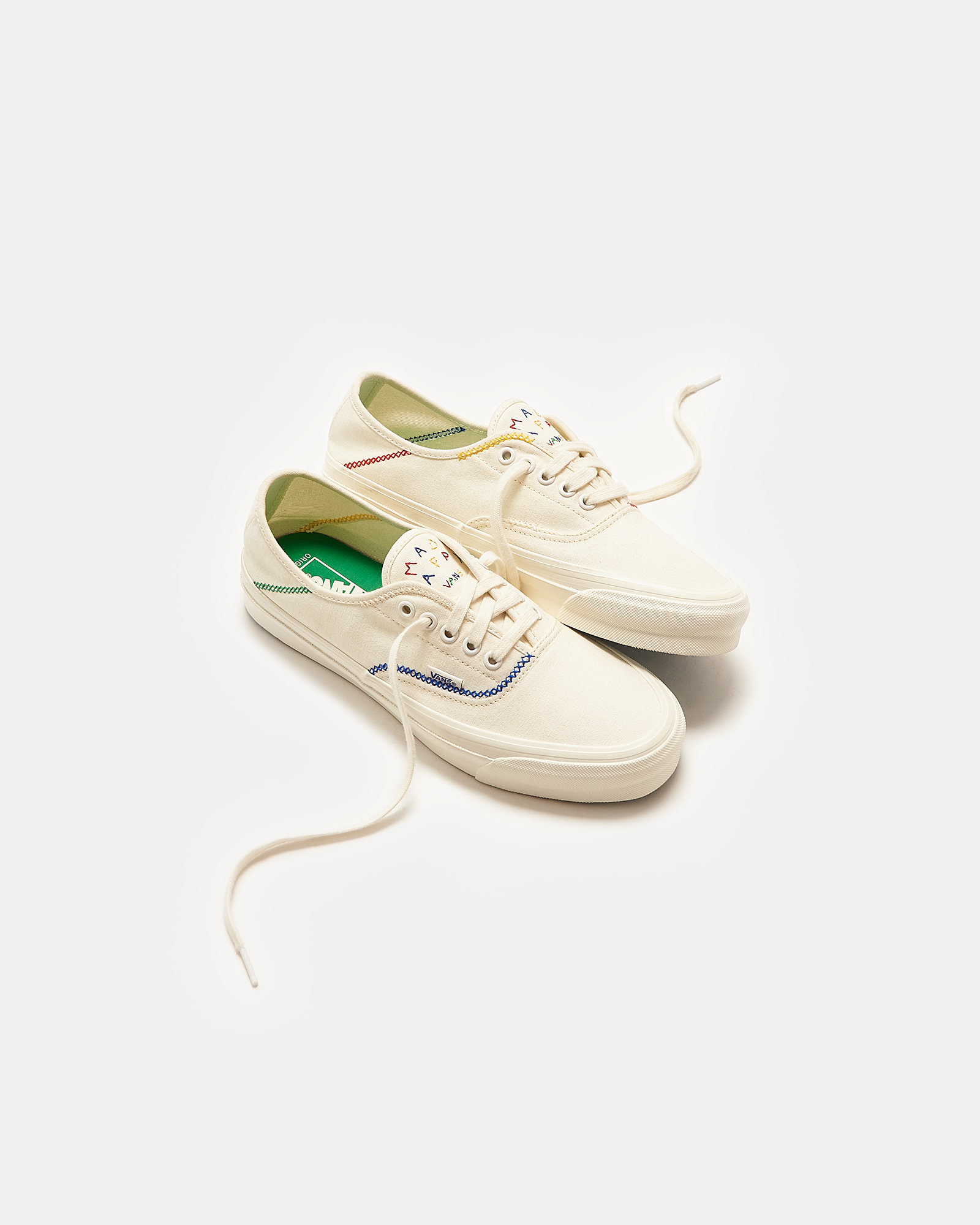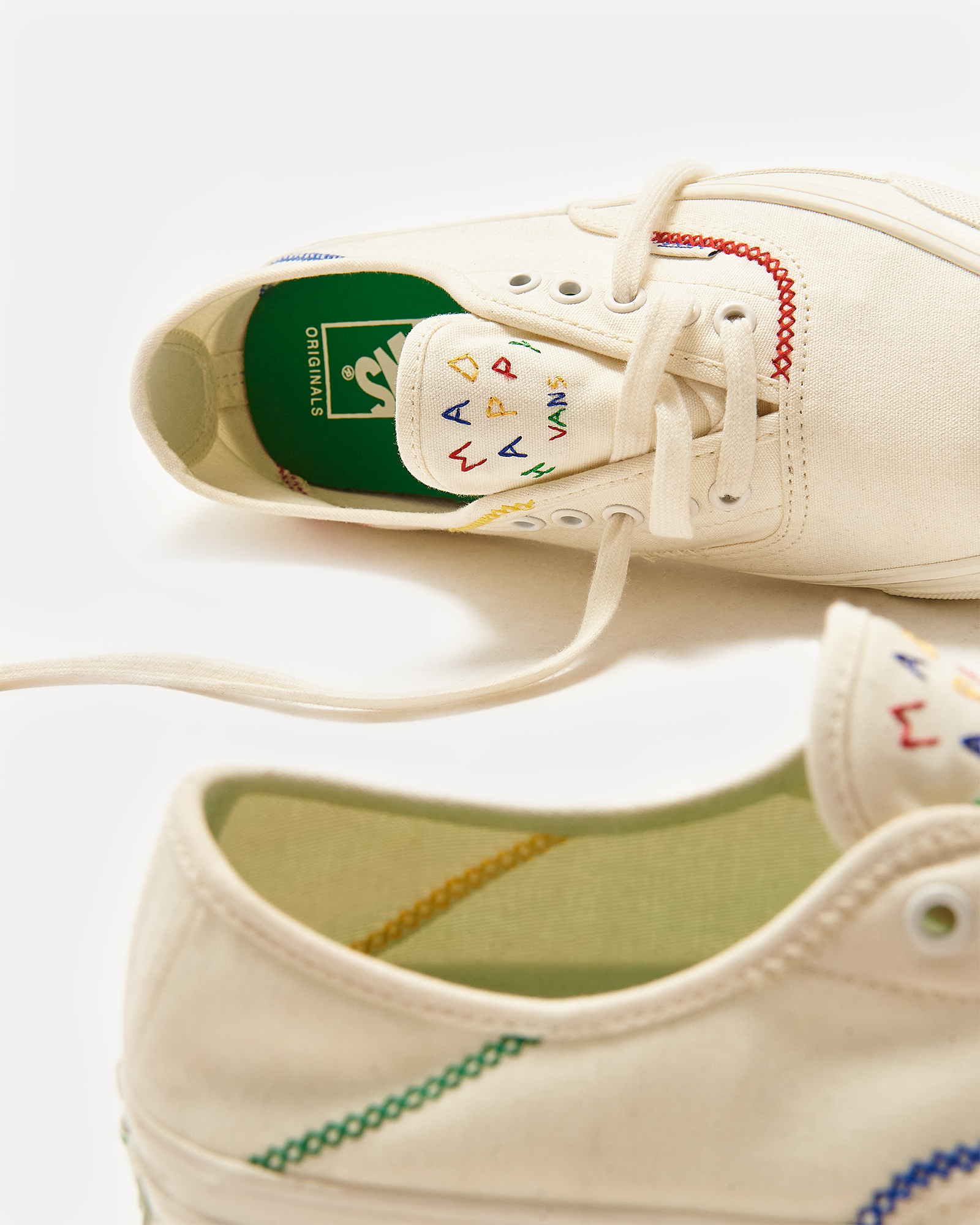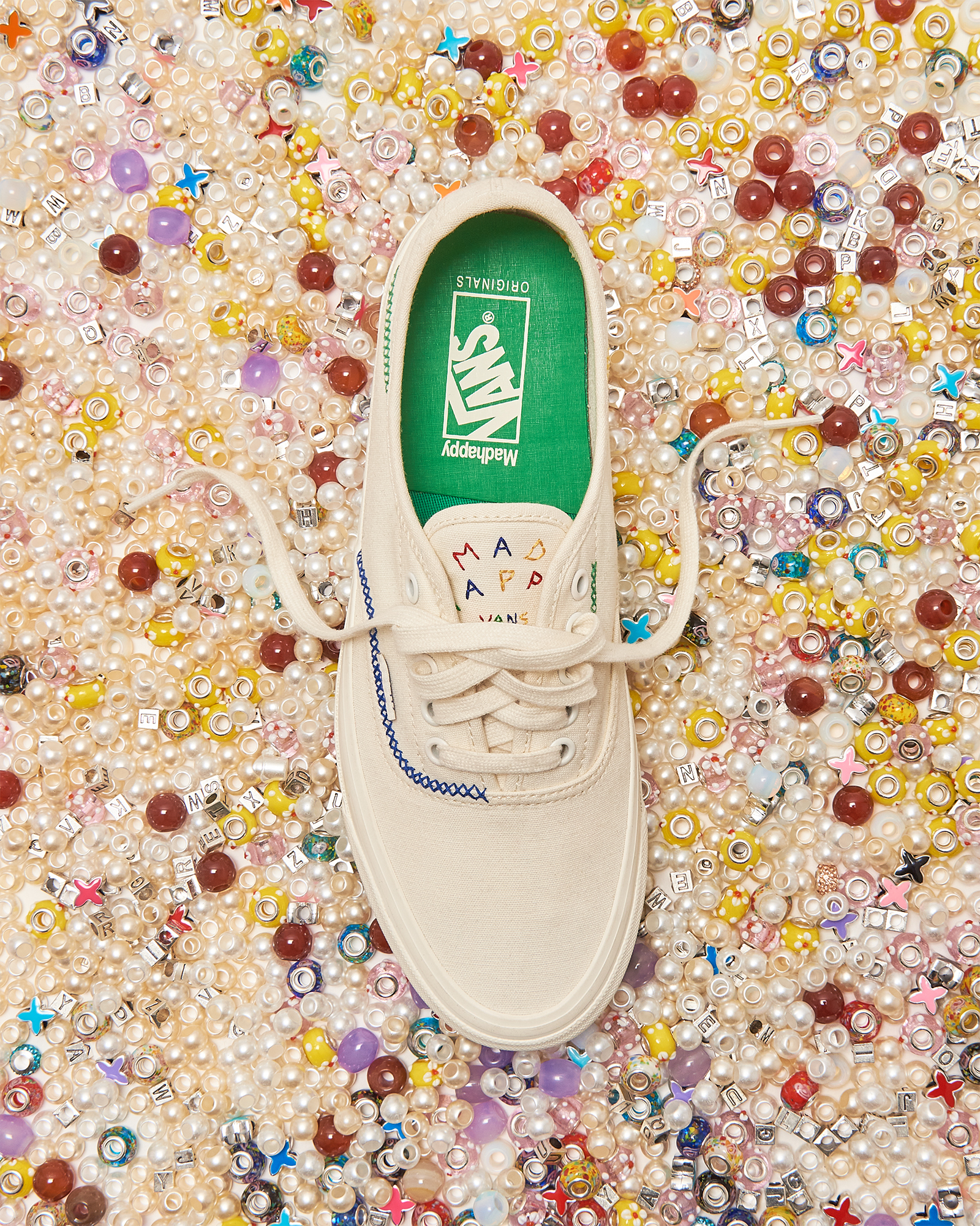 Reworking the OG Style 43 LX with primary color (red, yellow and blue) stitching, the like-minded brands have come together to create a sneaker that promotes community and camaraderie through customization. Taking inspiration from friendship bracelets, each pair comes with a set of beads (a mix of letters, colors and symbols) that allows the wearer to upgrade their Madhappy Vans with an individual message or daily reminder of positivity. The shoes are finished with an ice blue sole – a Vans rarity – and a unique heel that folds down into a slide to maximize comfort.