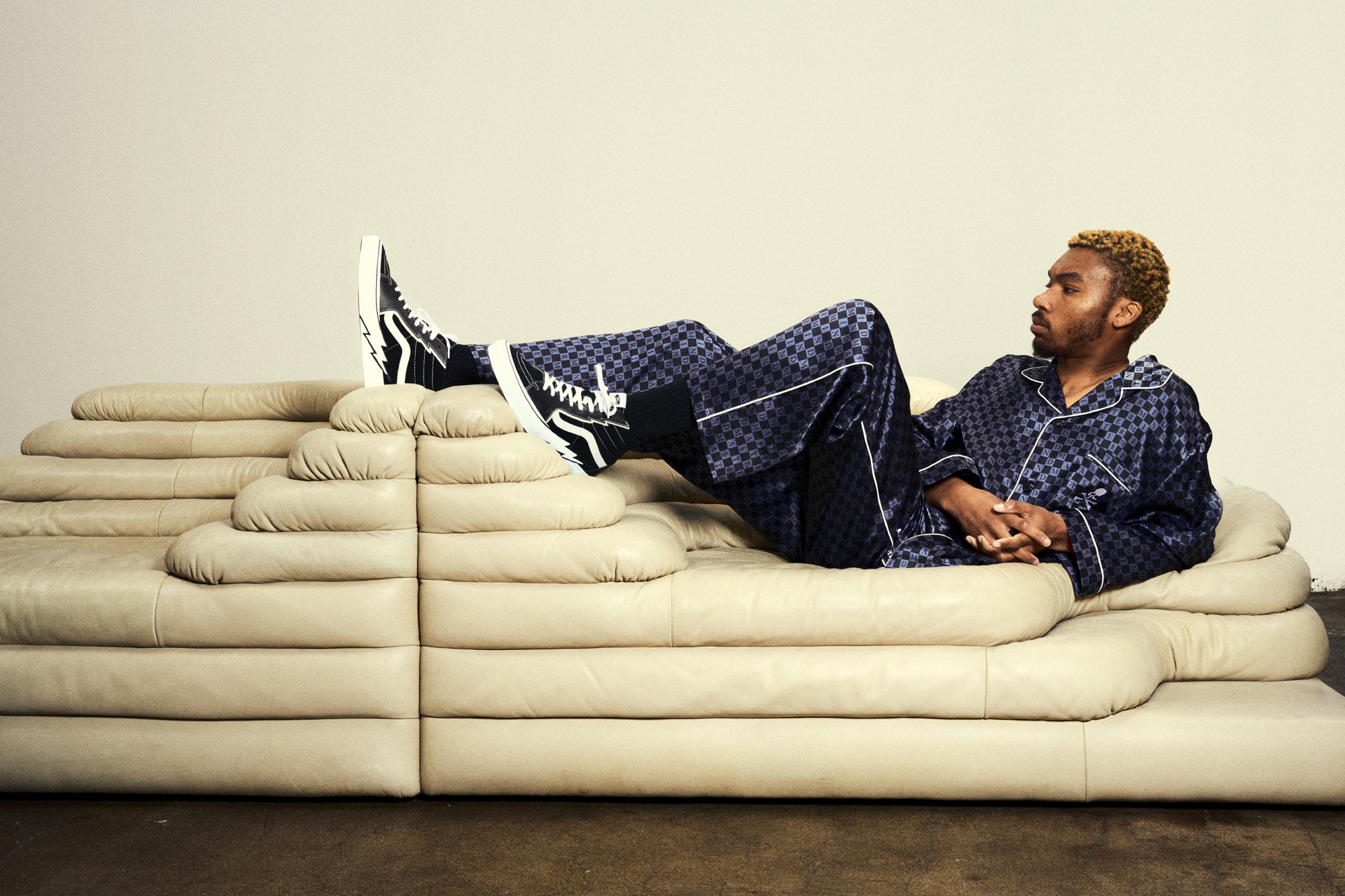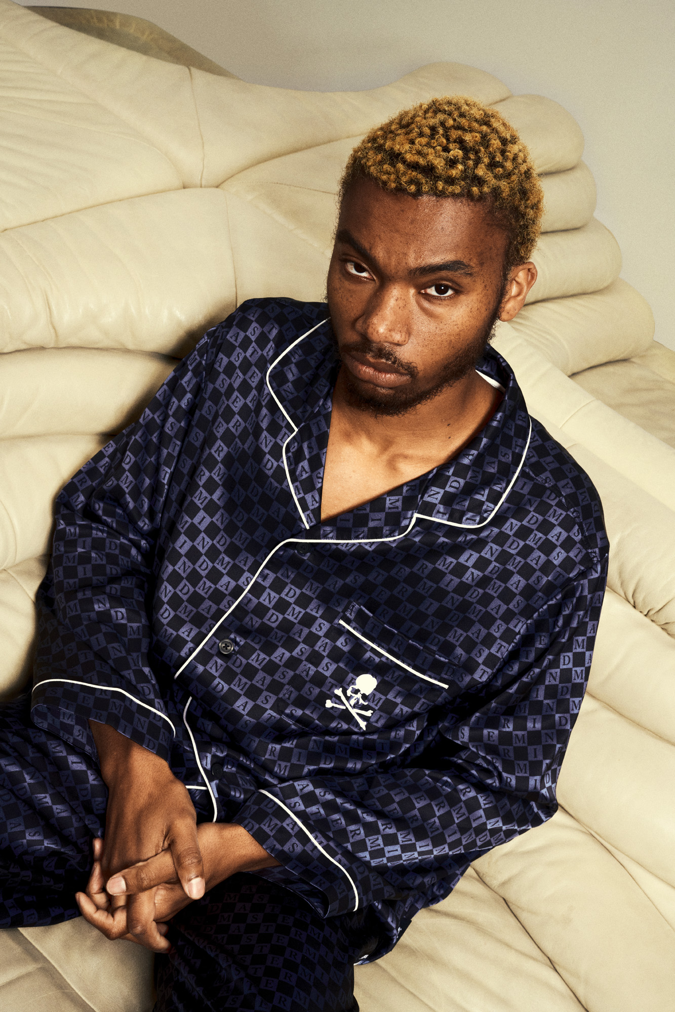 • MSTRMND PJ Shirt and Pants – Loose-fit, pajama style matching set made from 100% silk, monochromatic Checkerboard pattern, contrasting piping details, and embroidered logo on the chest pocket.