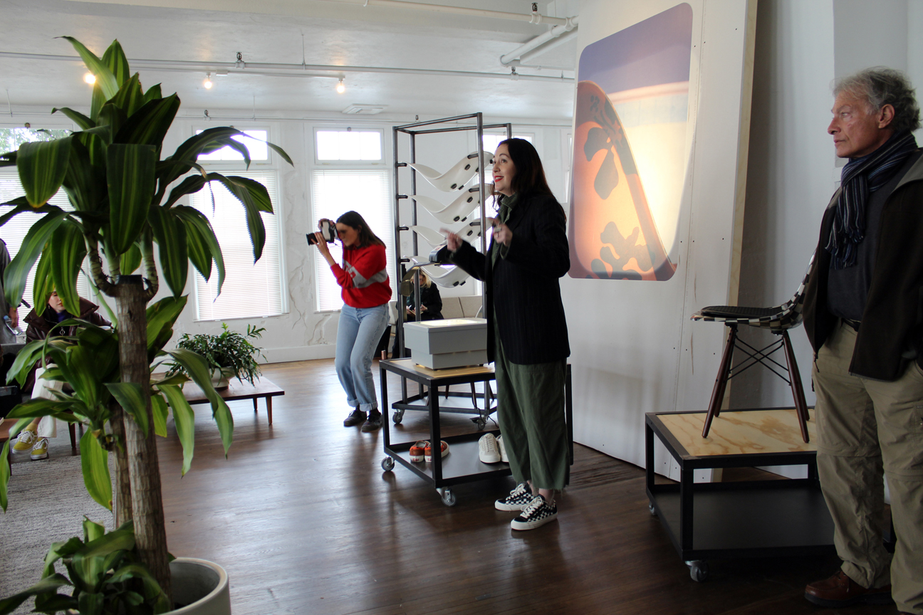 We got to see the actual chairs being produced, from their beginning stages of shredded fiberglass, to their very last step of assembly.  I felt bad, because we were obviously impeding on their workspace, getting in their way.  The place is loud, and I’m not sure if my high was because of simply being invited to the event, or just the fumes from the fiberglass resin filling the shop!  From there, it was on to the woodshop.  This is where the majority of the craftsmen work.  The amount of wood furniture and accessories they make, is staggering.  I love walking into a woodworking shop, and smelling the sawdust in the air.  You can’t walk out of this place without looking like Pig-Pen.  Co-owner Jay Novak, had mentioned to me while we were walking through the factory, that some of his craftsmen have been there for over 20 years, including multiple generations of family.  There’s so much going on here, it’s just so much to take in, in one day.  There’s a wood-forming machine that bends veneer sheets into those cool curved wooden furniture pieces you always wondered how they made.  There’s an upholstery shop, where all of the cushion and fabrics get attached, and there’s also a composites section where you see some other cool curvy fiberglass furniture being produced.  The archive section is also pretty neat, where you can see some of the past collabs stacked up on shelves, and also the blanks section where shells are ready to be custom ordered.  It’s definitely a beehive of activity.
