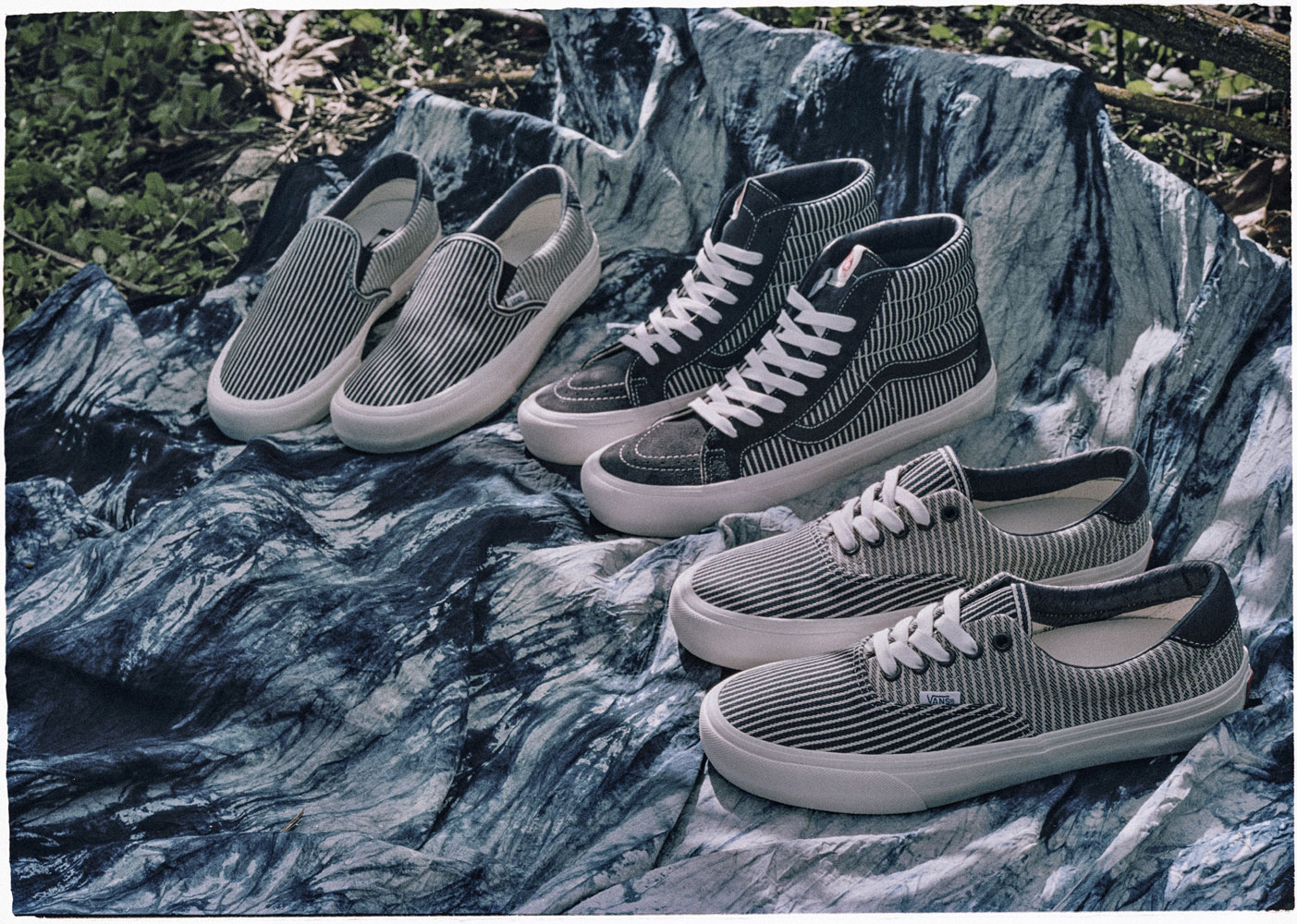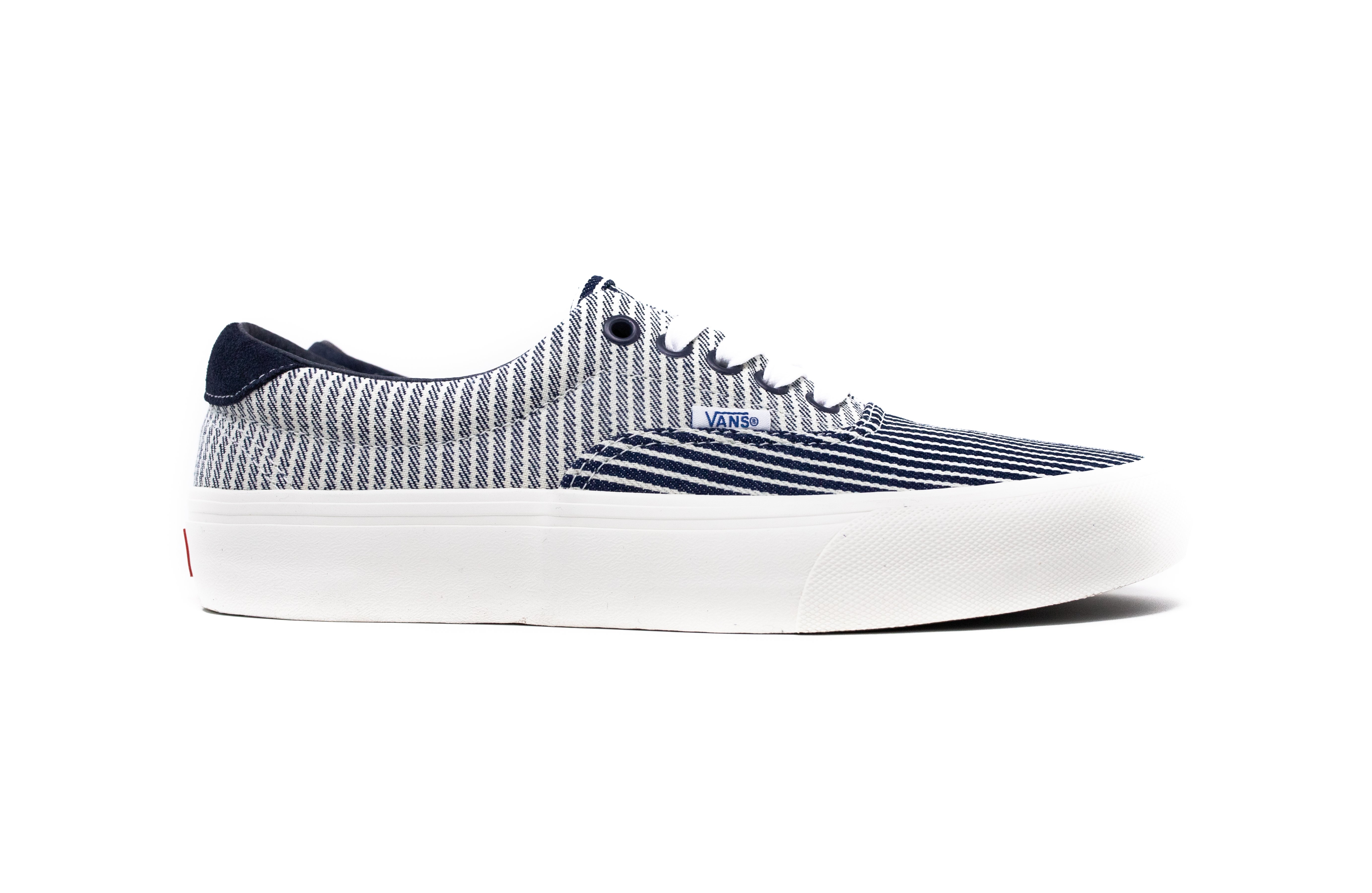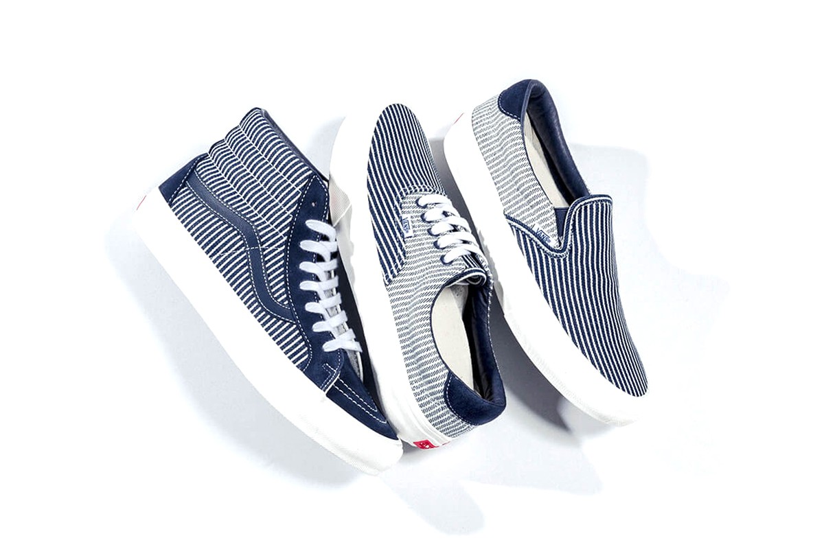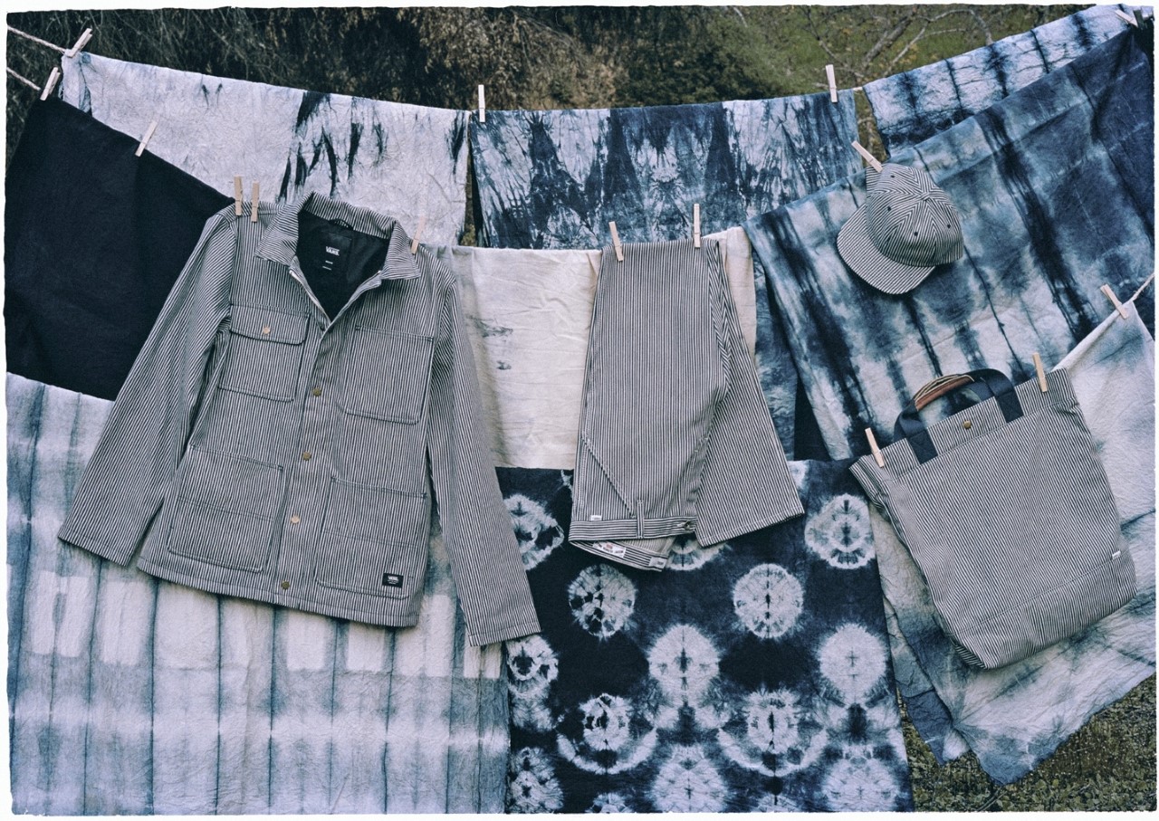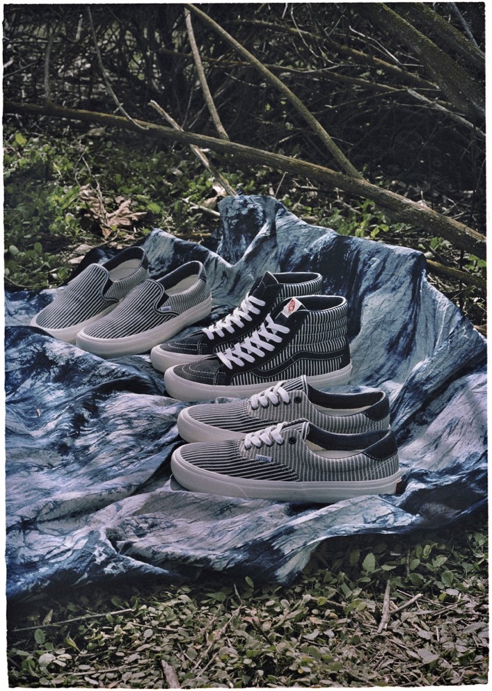 Complimenting the Drill Chore Coat in Hickory Stripe, Vans introduces the Provision Utility Pant, tote bag and striped jockey hat all in matching denim. In addition to the limited-edition apparel and accessories, Vans’ classic icons – the Era, Sk8-Hi and Classic Slip-On – are dressed and assembled with custom the Mount Vernon Mills fabrication”.