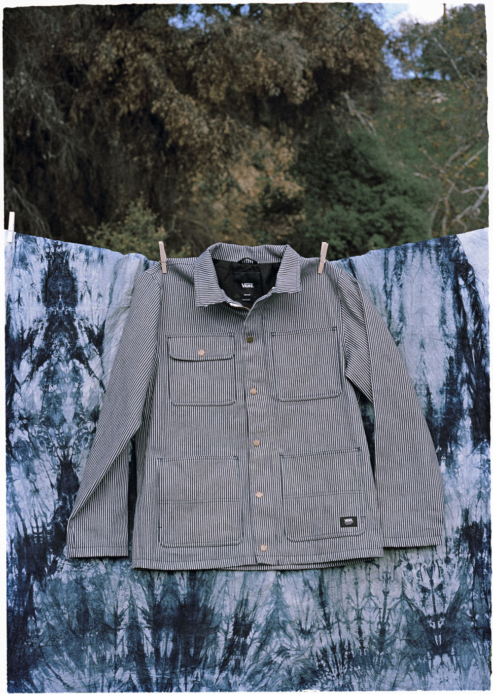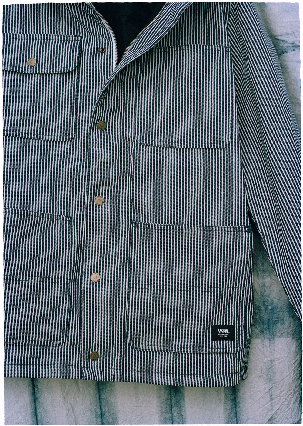 “Taking premium design elements from the ground up, Vault by Vans introduces an elevated update to Vans’ Pro-built Drill Chore Coat, constructed from the last remaining denim mill in the USA. Available in 100% cotton Hickory Stripe denim made in Trion, Georgia at Mount Vernon Mills, the heavy-duty coat is lined with cotton twill and features a custom Mount Vernon Mills label at interior chest welt pocket, a low-profile snap front placket with hidden zipper and dual entry patch pockets.