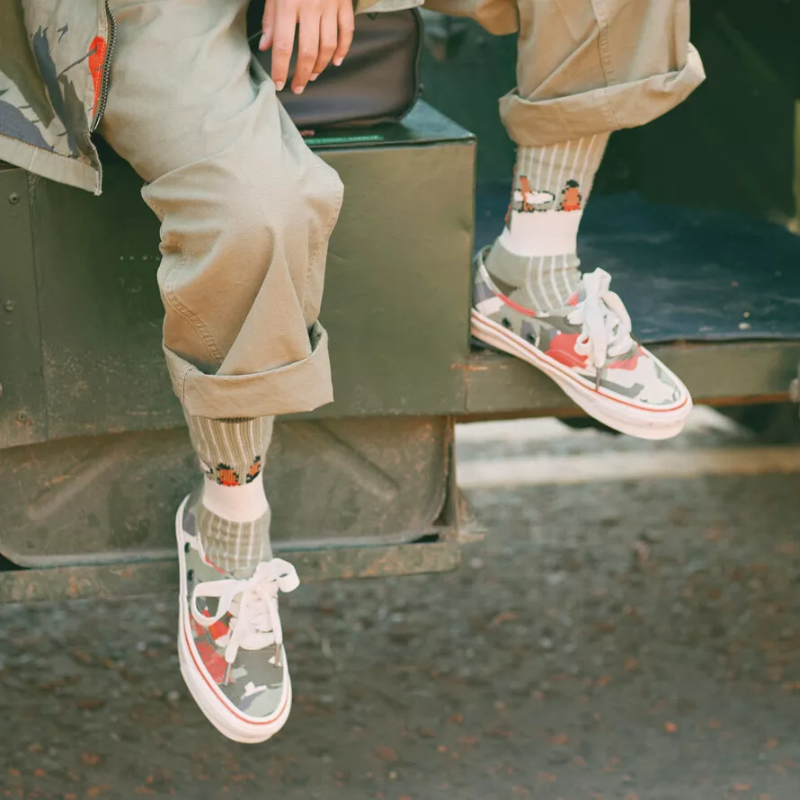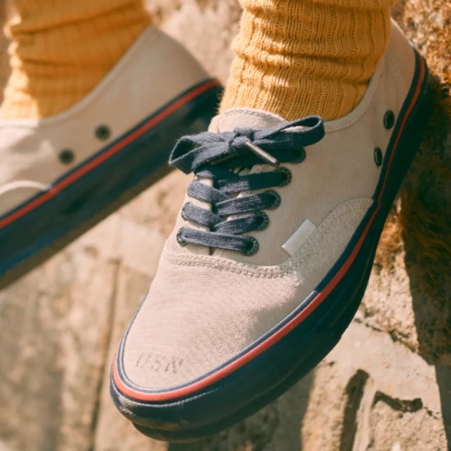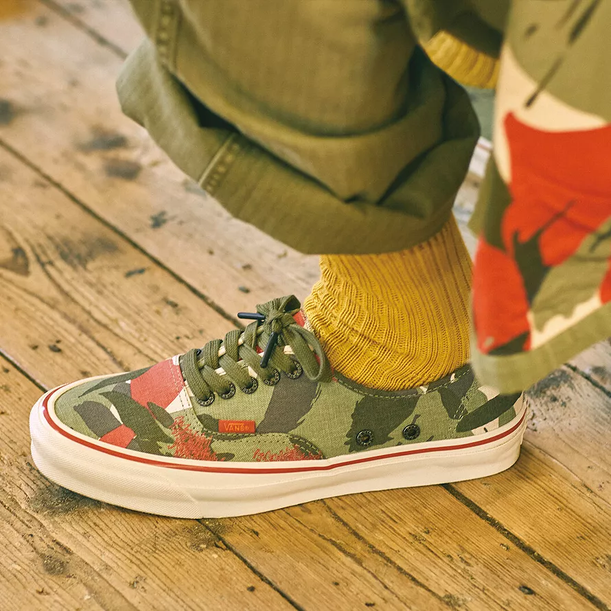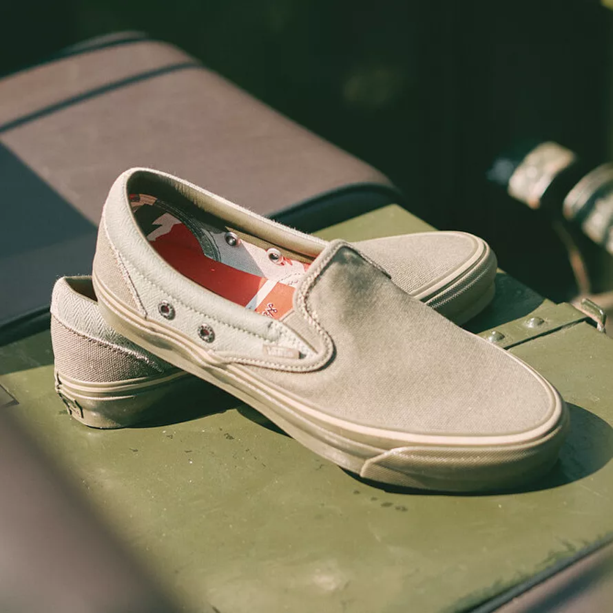 Hailing from the North East of England, Nigel Cabourn teams up with Vault by Vans for a collection of footwear and apparel. Best known for his unisex outerwear and vintage-style designs, the Vault by Vans x Nigel Cabourn collection draws inspiration from his personal vintage collection and military-inspired bags and clothing from the 1940s-1970s. Working with Emilie Casiez, the head of Nigel Cabourn Women’s, the collection features rugged textiles, brushed and chipped metal vent holes, custom camp linings, and foot beds to highlight vintage military materials, colors, and aesthetic. This unisex collection also features one-of-a-kind artwork by Taji Matsuda and custom details, like Nigel’s hand drawn arrowheads and deco stitching.
