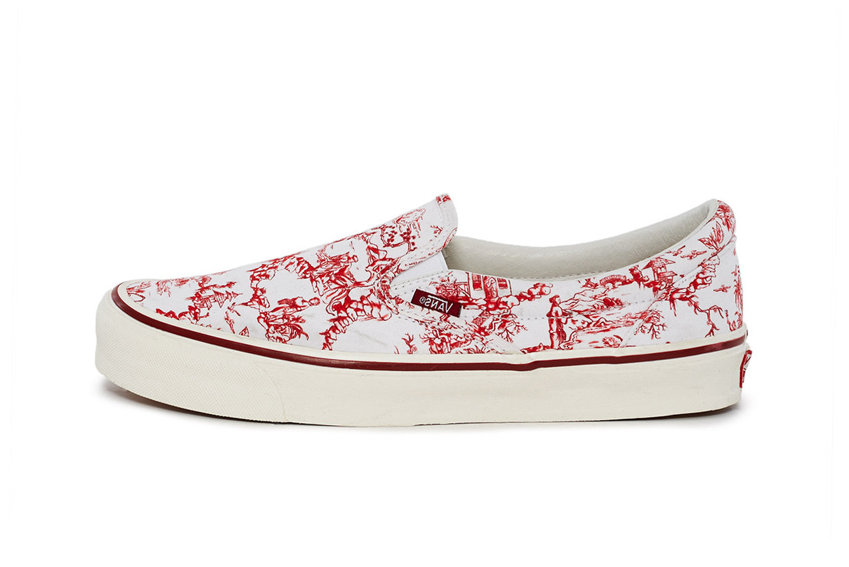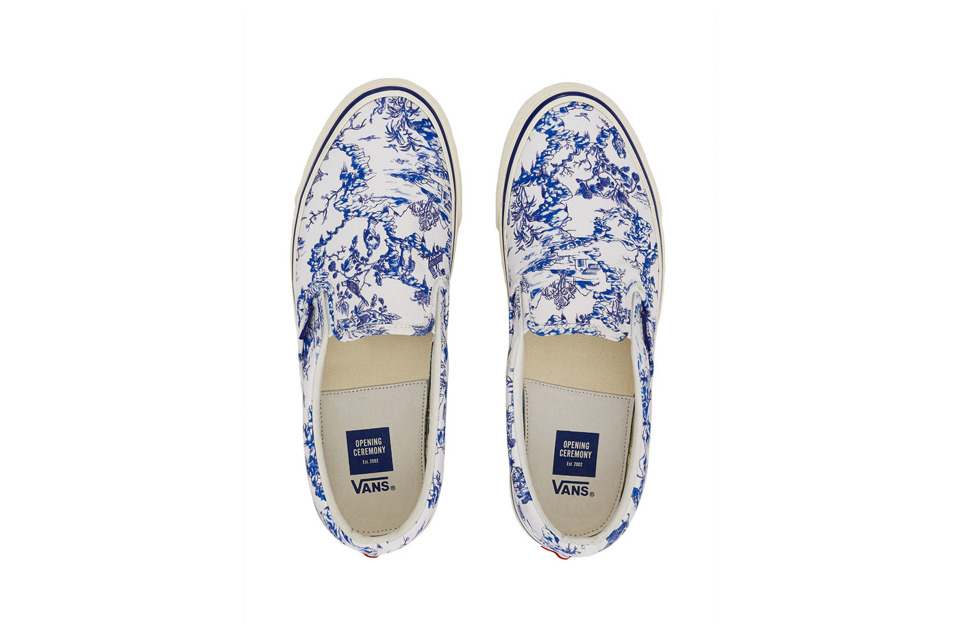 Vans for OC’s toile pack features Vans’ classic slip-on sneakers with printed canvas uppers inspired by Chinoiserie, the traditional design of Chinese porcelain ware. Available in Red or Blue, with Marshmallow accents. Pick them up from Opening Ceremony now.