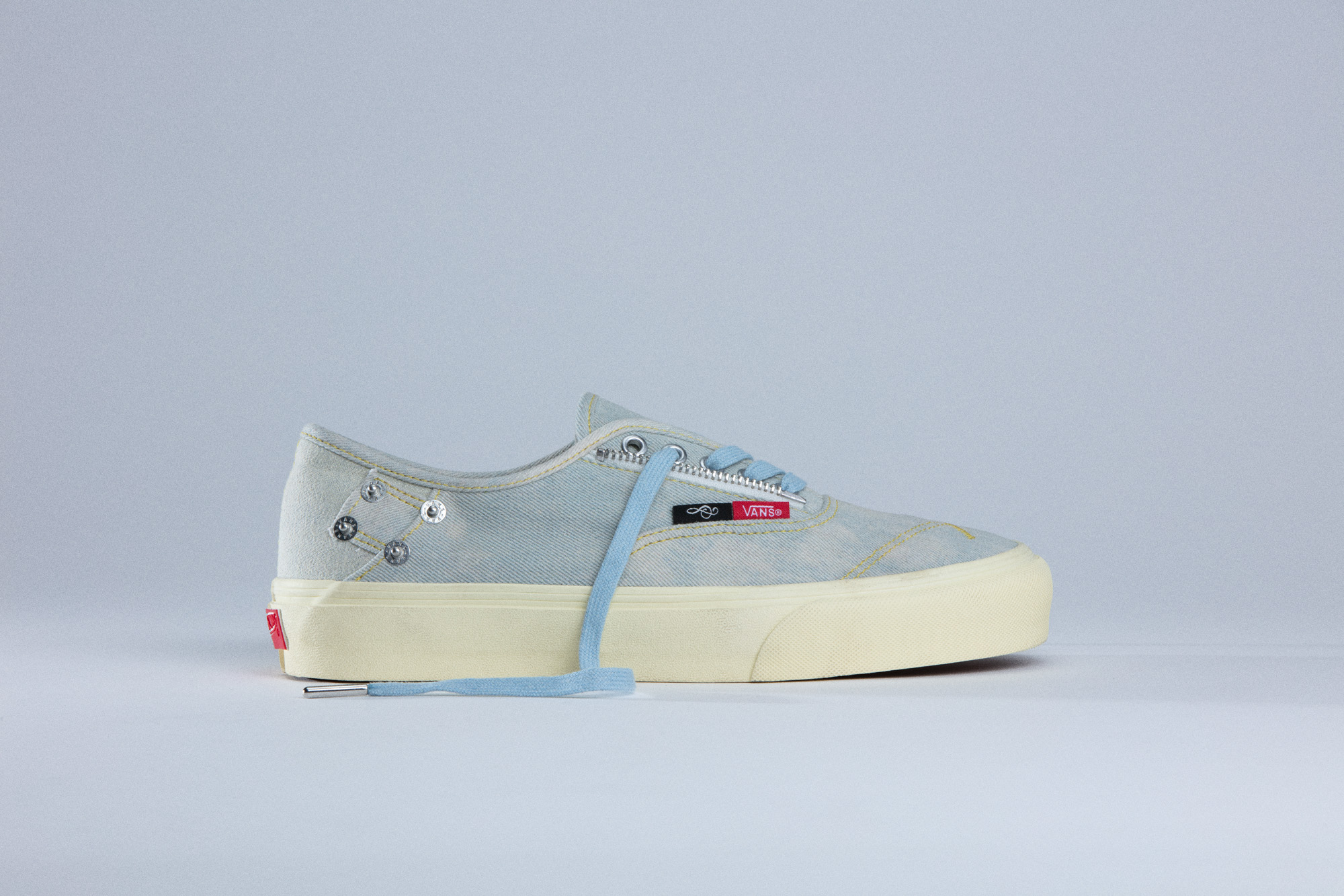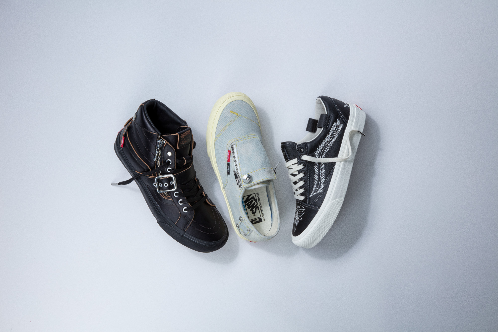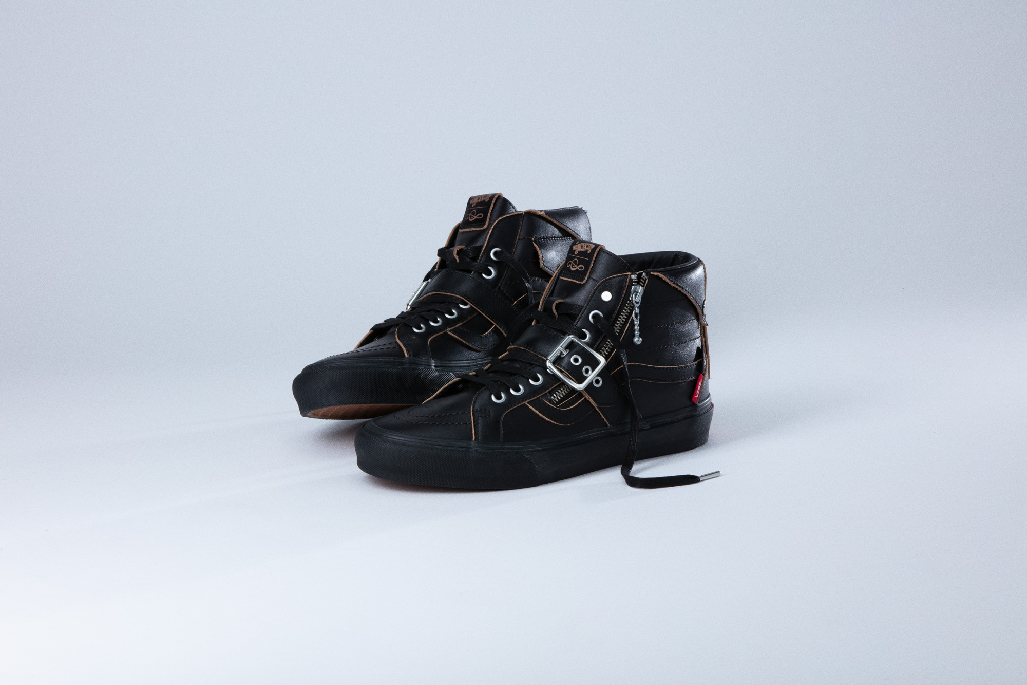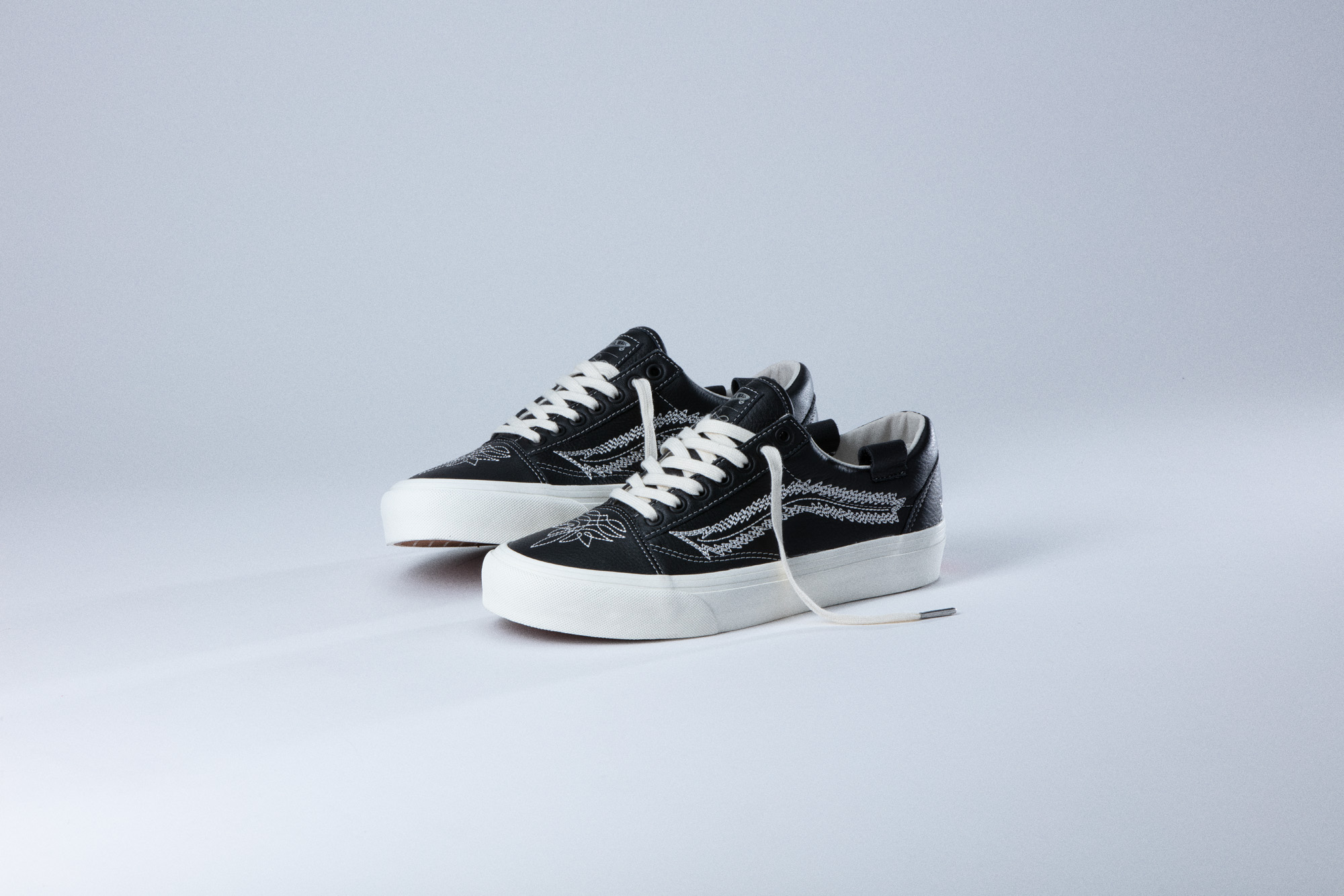 Black leather Old Skool VLT LX sneakers feature traditional Western cowboy embroidery creating a contrasting and multi-dimensional aesthetic that is both modern and nostalgic. The Authentic Zip VLT LX is reimagined in classic blue denim with hidden laces and chrome detailing, while the Sk8-Hi Reissue Strap VLT LX in black leather has several riders jacket details such as collars, epaulets, and buckles.