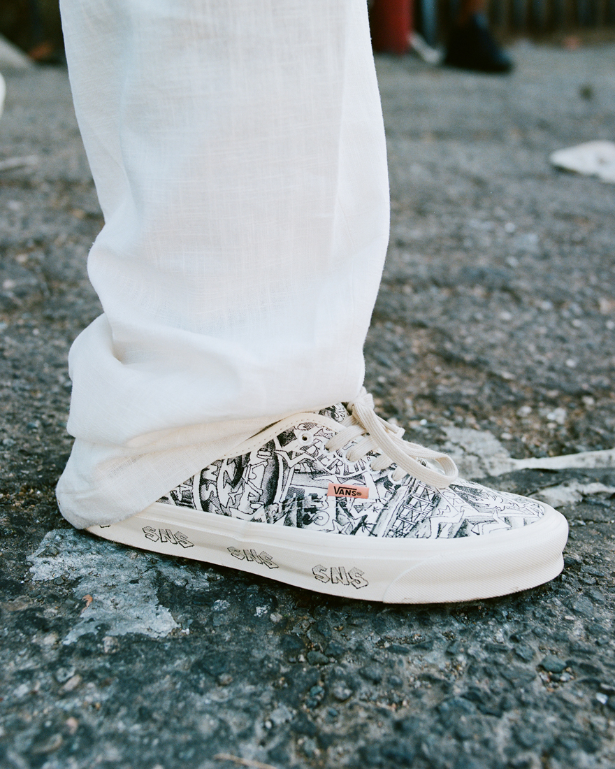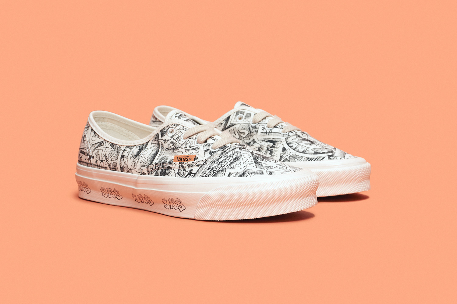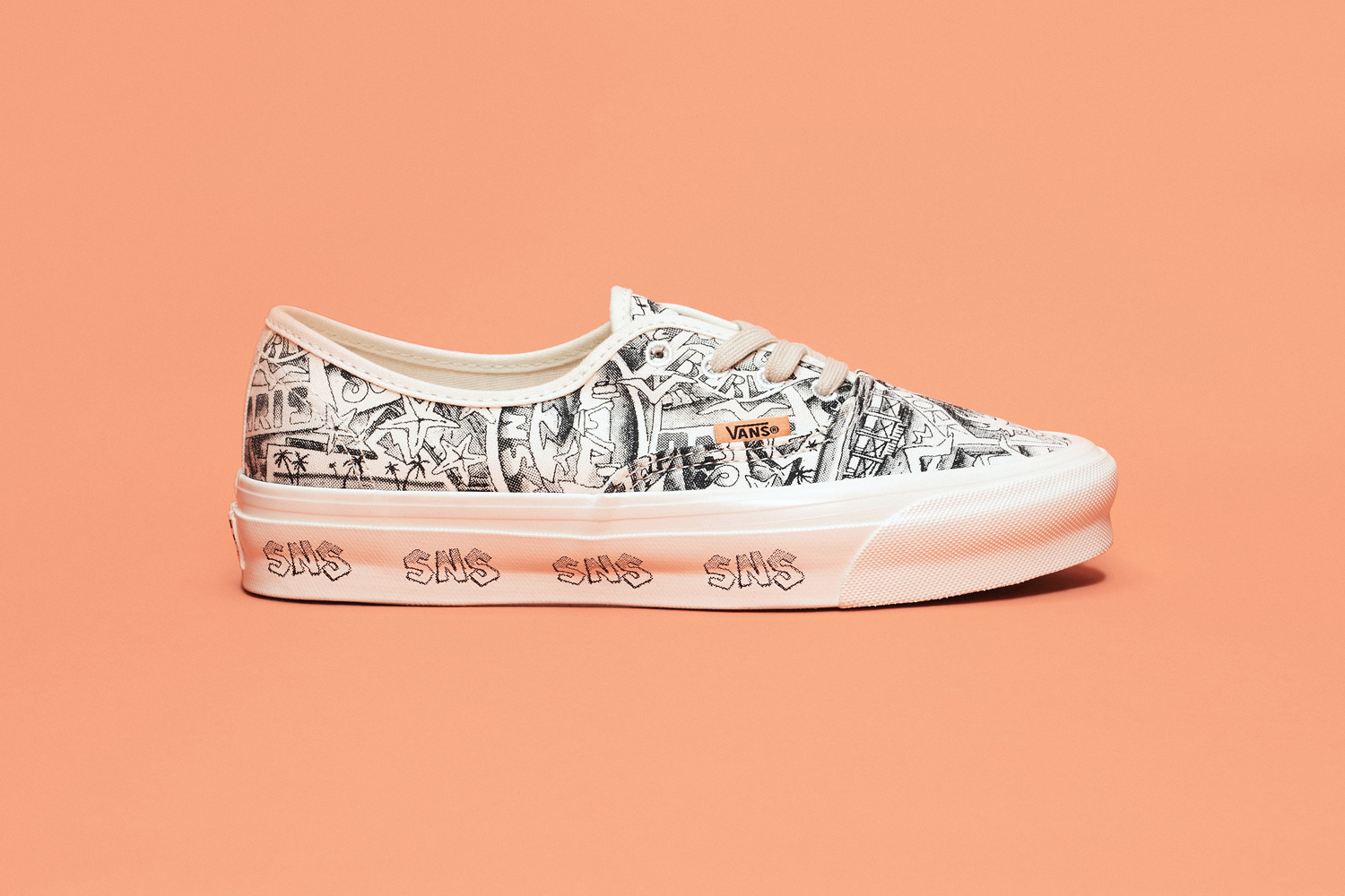 Crafted with signature canvas, a vulcanized midsole with “SNS” lettering and the iconic waffle outsole, the Authentic LX features the artwork printed all over the upper. The striking design is also featured on the premium cotton short-sleeve tee. Equipped with a chest and back print, the SNS t-shirt is followed by a summer-ready linen pant with an adjustable waistband, button closure, zip fly and several pockets to complete the Vault by Vans x SNS look.