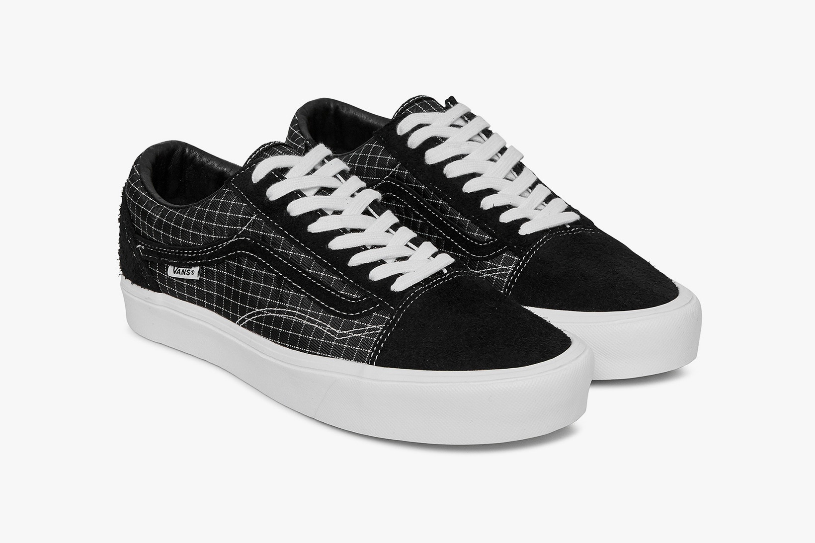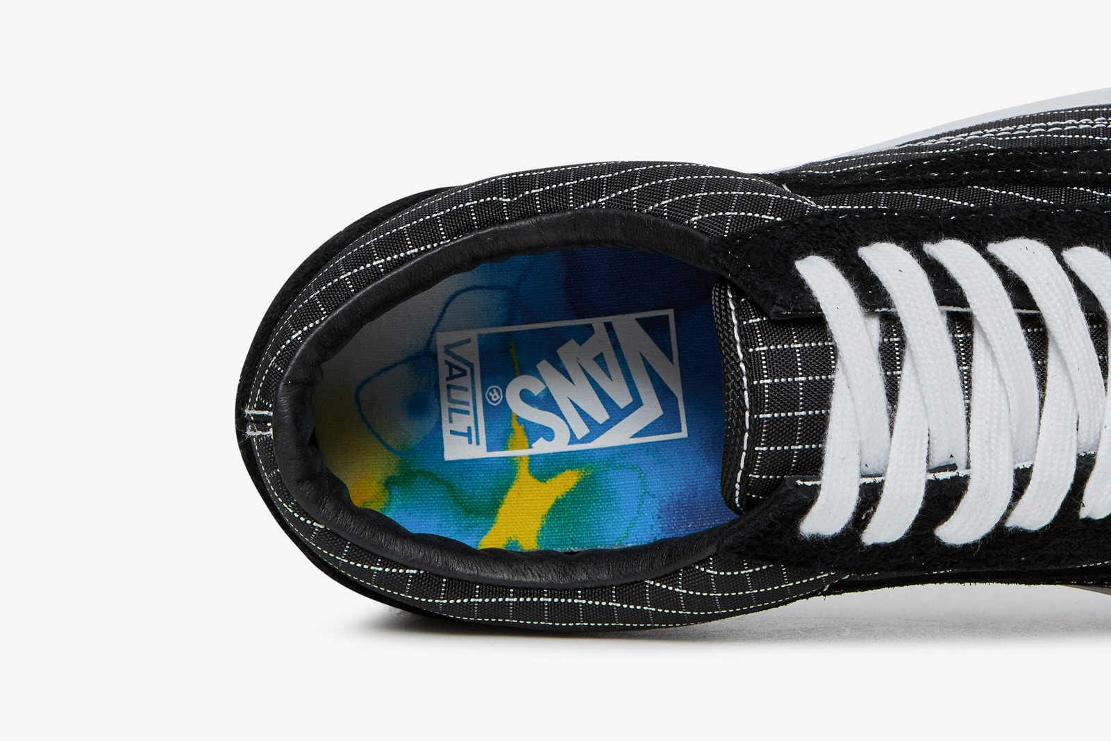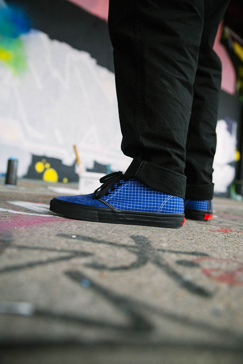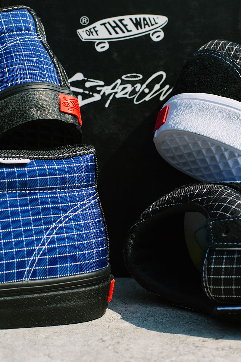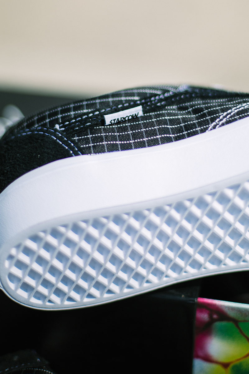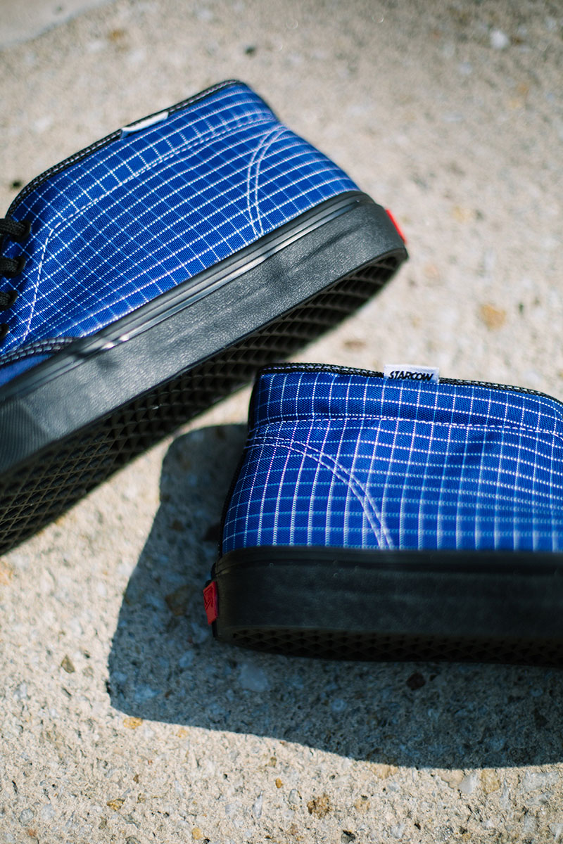 “Parisian boutique Starcow introduces a pair of collaborative Vans silhouettes, each sporting revised detailing. Both pairs feature bi-color blue/black or black/white makeups, with the laces and midsoles contrasting against tonal mesh and suede uppers. Juxtaposed against the unaltered suede panels are slim windowpane check patterns, complementing the contrast stitching seen throughout. The foxing stripe on the midsole has been removed, further emphasizing the red Vault license plate branding on the heel.”