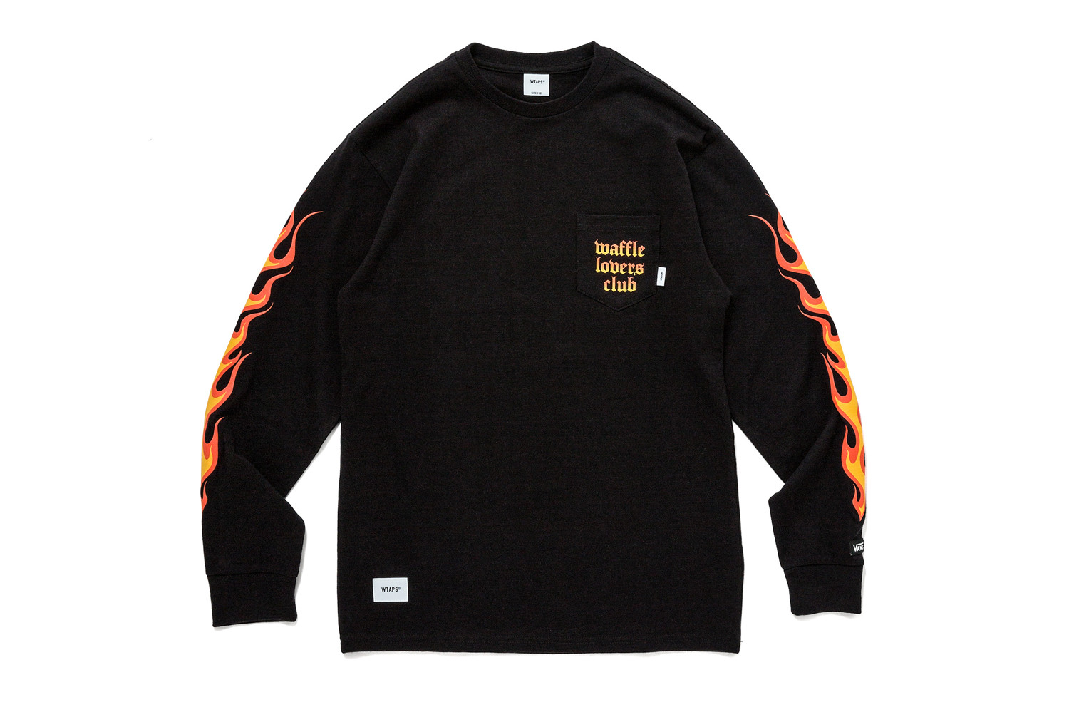 Thanks to Overkill, Berlin, we get a first sneak peek at the upcoming Vault x WTAPS collaboration. This pack has some design cues taken from prior Vault x WTAPS collections, as well as an all new wild design. Taking cues from the Fall 2013 collab, the OG Old Skool LX features the same “Surplus” canvas and suede design, in the same olive and navy colorways. It’s funny, because Vans created a GR version of this style shortly after the Vault one, which was a nice alternative to the absurd asking prices of the OG Sk8-Hi due to Kanye being seen in them. New heads won’t understand the reasoning why that shoe still resells for so high. Anyways, on to the OG Era LX. They take cues from the Fall 2015 collection, inspired by Steve Caballero’s original colorway of the Caballero, aka Full Cab, aka OG Full Cab, featuring a black suede and either grey or olive croc pattern on the side panels, while sitting on top of black midsoles. The newest and fresh design we have, are the “Ultra Litty” “Gucci LaFlame” “Flavor Town” OG Sk8-Hi LX, featuring an all black canvas and suede material, with a bold orange or blue flame graphic embroidered on the side panels of the shoe. Hate ’em or love ’em, they definitely stand out. There’s also another new design, by way of a digicamo Half Cab LX, which there’s also a matching digicamo longsleeve tee to go with it. There’s also a few other apparel pieces, and a duffel bag. Check them out after the jump.