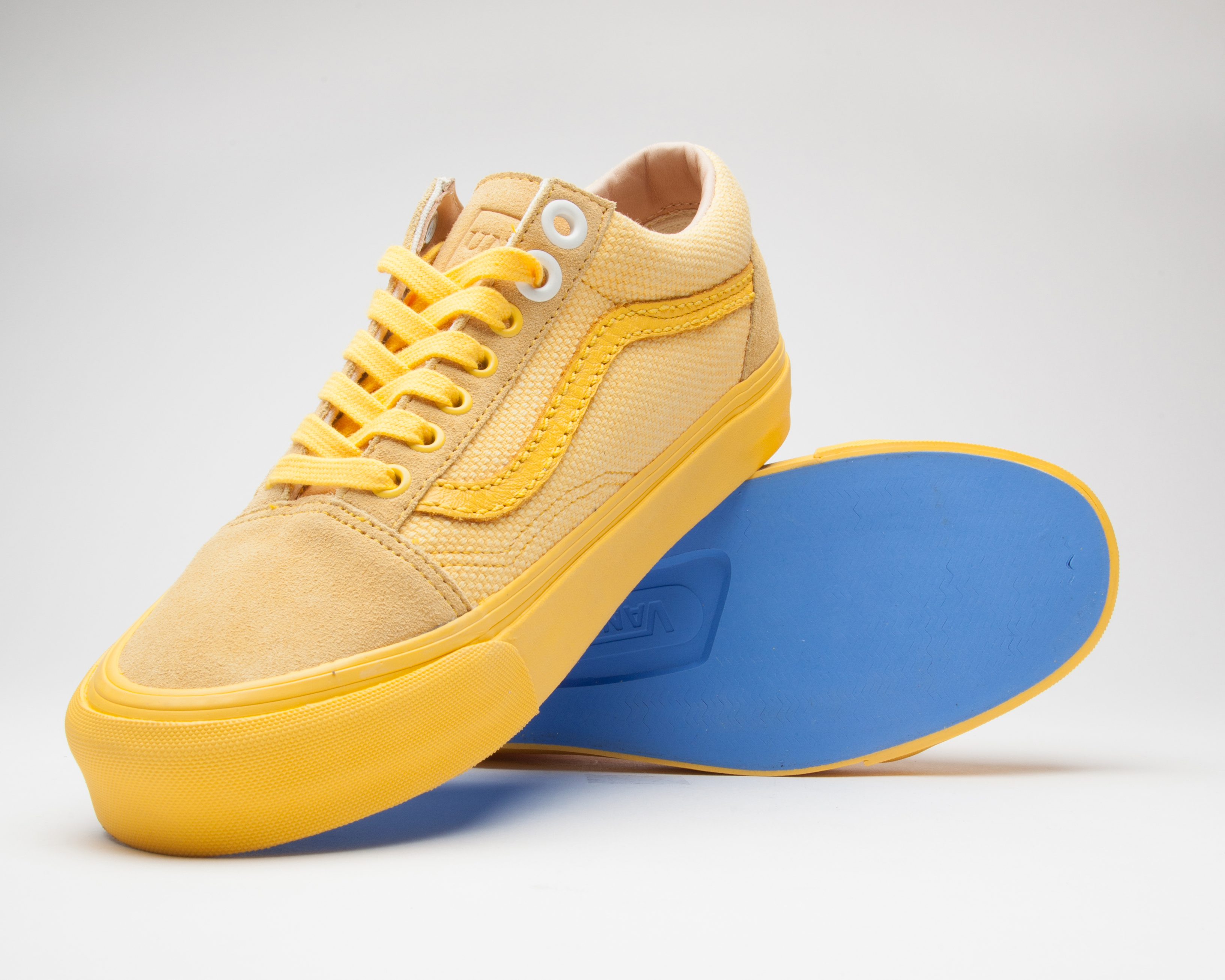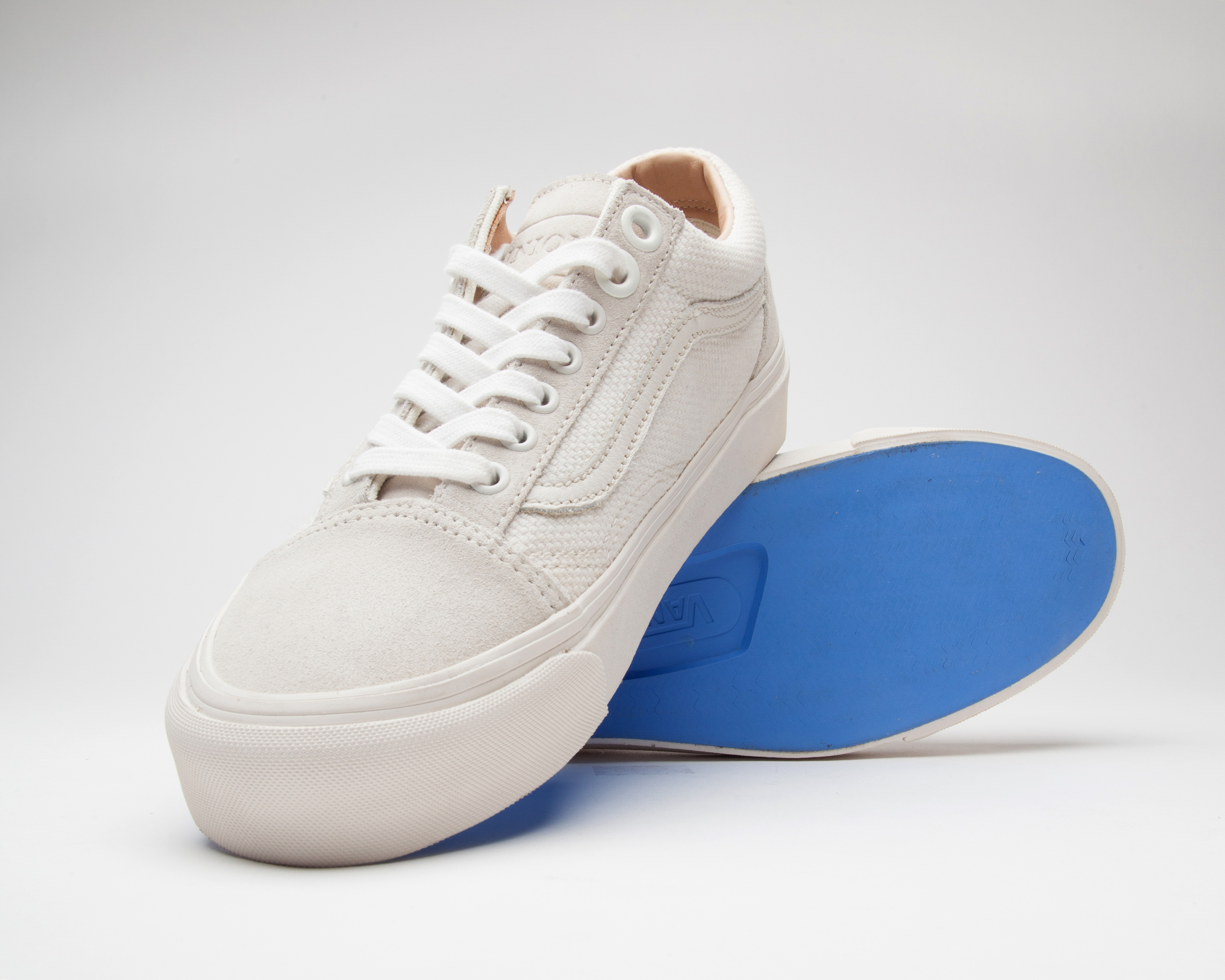 The shoe’s design is simple, but the devil is in the details. For the main body of the shoe we used a “lux” twill weave matched with a smooth, buttery suede and the Vans “stripe” is made of a smooth “lux” pebble grain leather. Each shoe is tonal, head to toe with the exception of the inner shoe, we used a natural veg-tan leather on. As for the sole unit, we popped with a marine blue boat-shoe sole, just for shits and giggles.